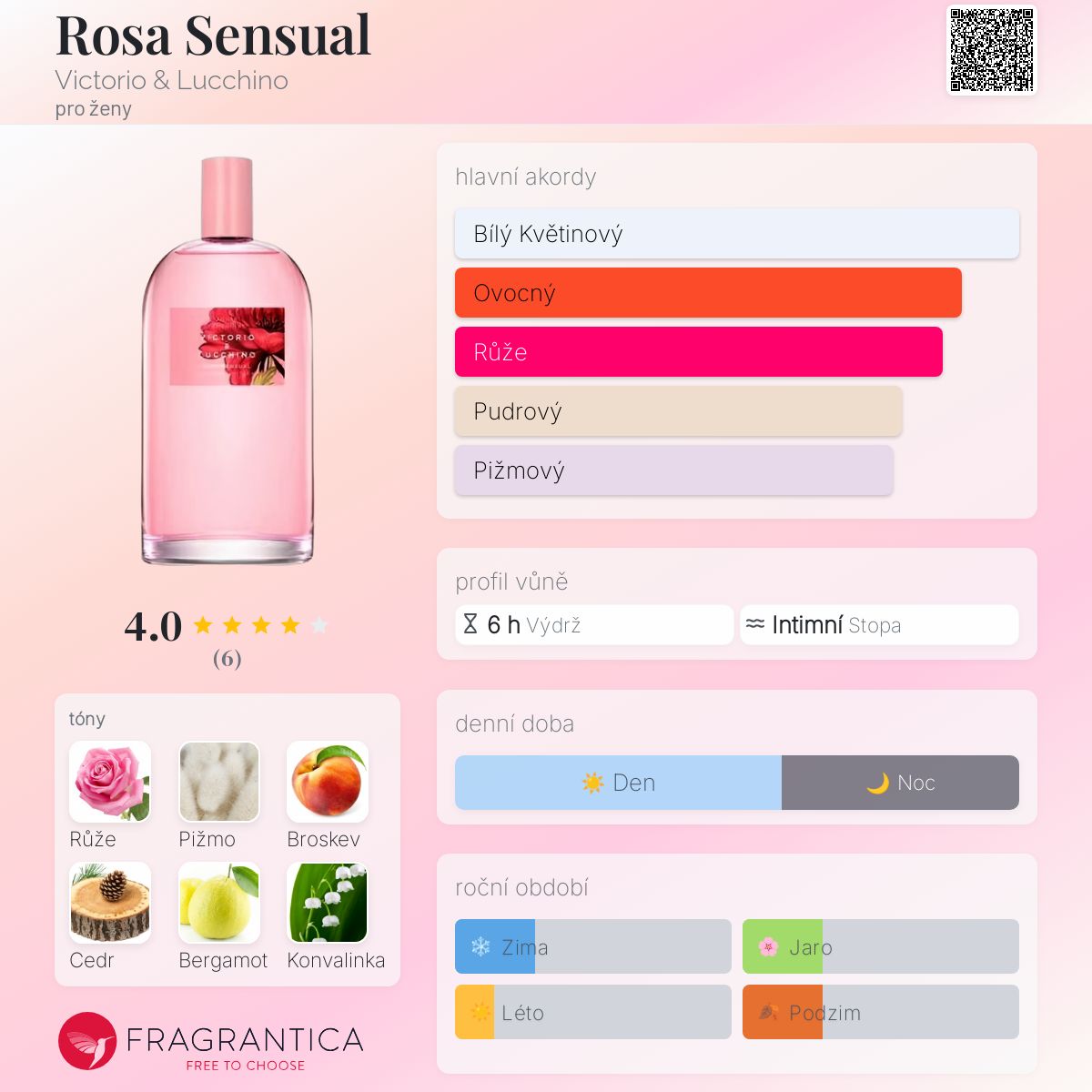 Rosa Sensual podle Victorio & Lucchino je Floral vůně pro ženy. Toto je nová vůně. Rosa Sensual byl/a uveden/a v roce 2025. Vrchní tóny jsou Broskev, Bergamot a Červené bobule; střední tóny jsouRůže, Konvalinka a Jasmín ; základní tóny jsou Pižmo, Cedr a Jantar (ambra).