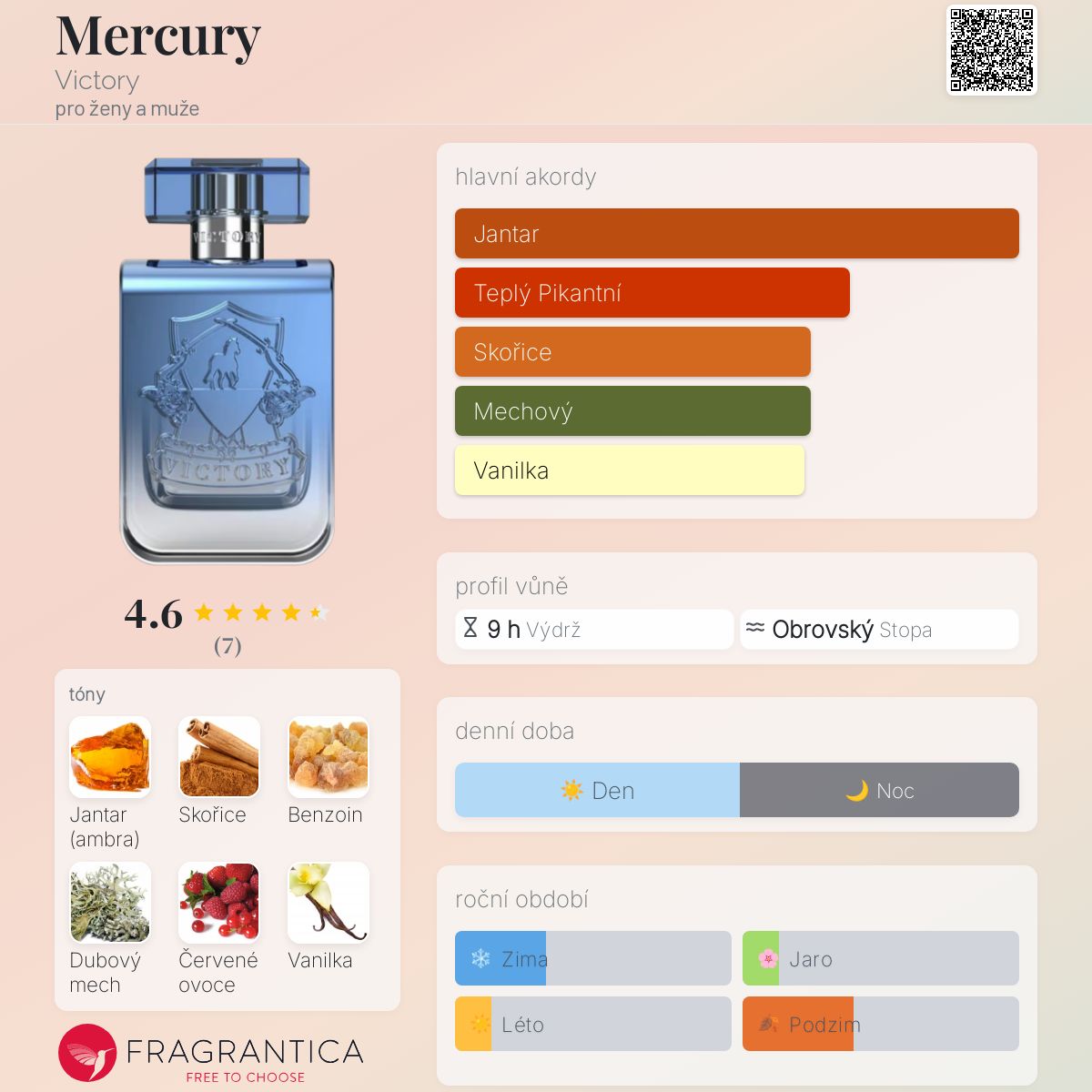 Mercury podle Victory je vůně pro ženy a muže. Mercury byl/a uveden/a v roce 2023. Vrchní tóny jsou Červené ovoce, Zázvor a Mandarinka; střední tóny jsouSkořice, Jasmín a Pomerančový květ ; základní tóny jsou Jantar (ambra), Benzoin, Dubový mech a Vanilka.