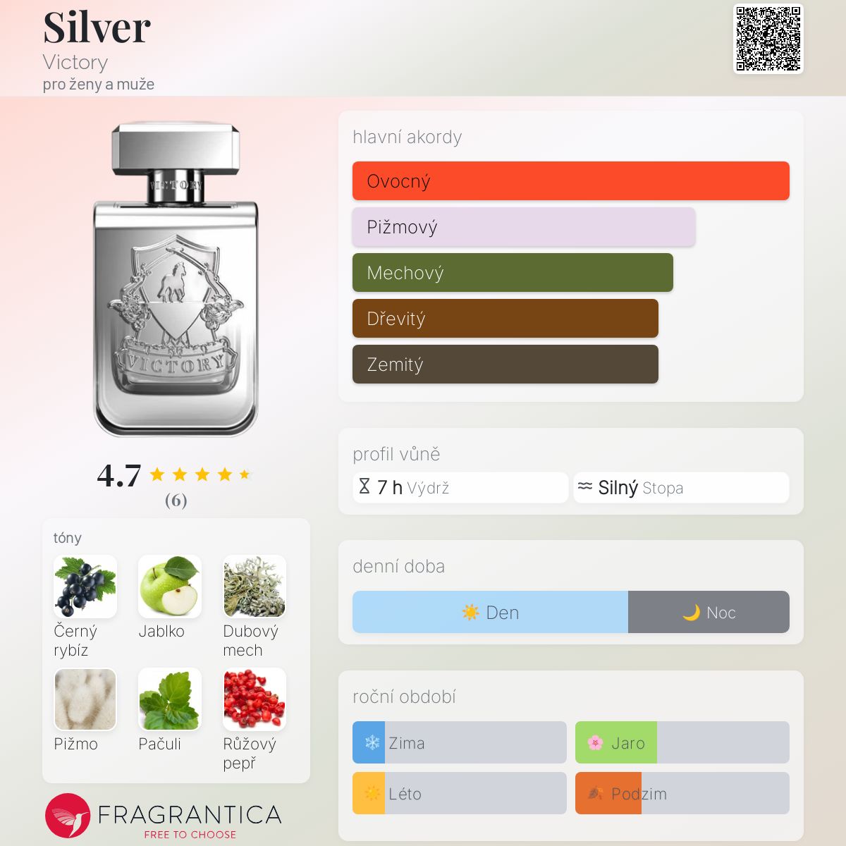 Silver podle Victory je vůně pro ženy a muže. Silver byl/a uveden/a v roce 2020. Vrchní tóny jsou Černý rybíz a Jablko; střední tóny jsouPačuli a Růžový pepř ; základní tóny jsou Dubový mech, Pižmo, Jantar (ambra) a Vanilka.