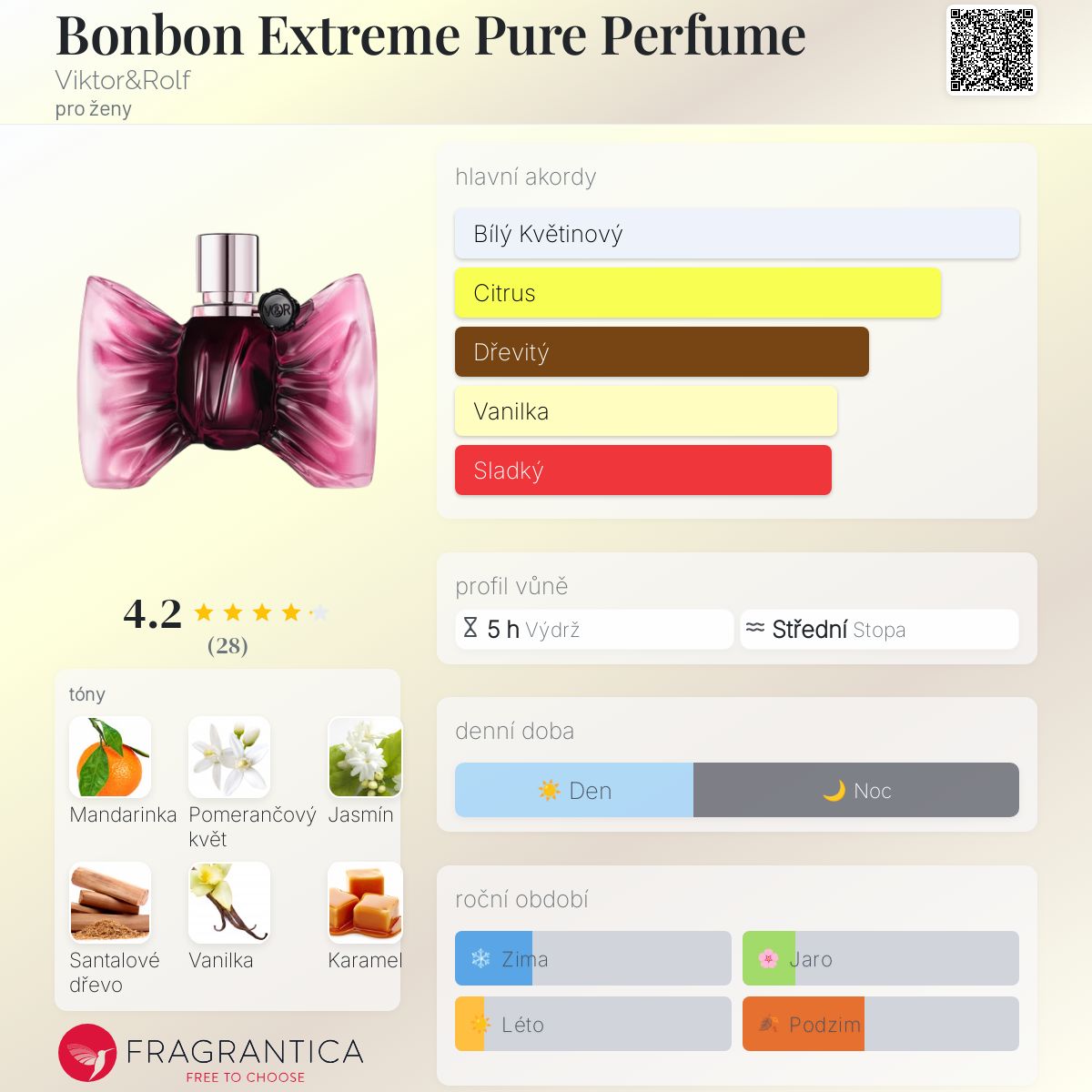Bonbon Extreme Pure Perfume podle Viktor&Rolf je Floral Fruity Gourmand vůně pro ženy. Bonbon Extreme Pure Perfume byl/a uveden/a v roce 2021. Vrchní tóny jsou Mandarinka, Broskev a Neroli; střední tóny jsouPomerančový květ, Jasmín Sambac a Karamel ; základní tóny jsou Santalové dřevo, Vanilka a Pačuli.