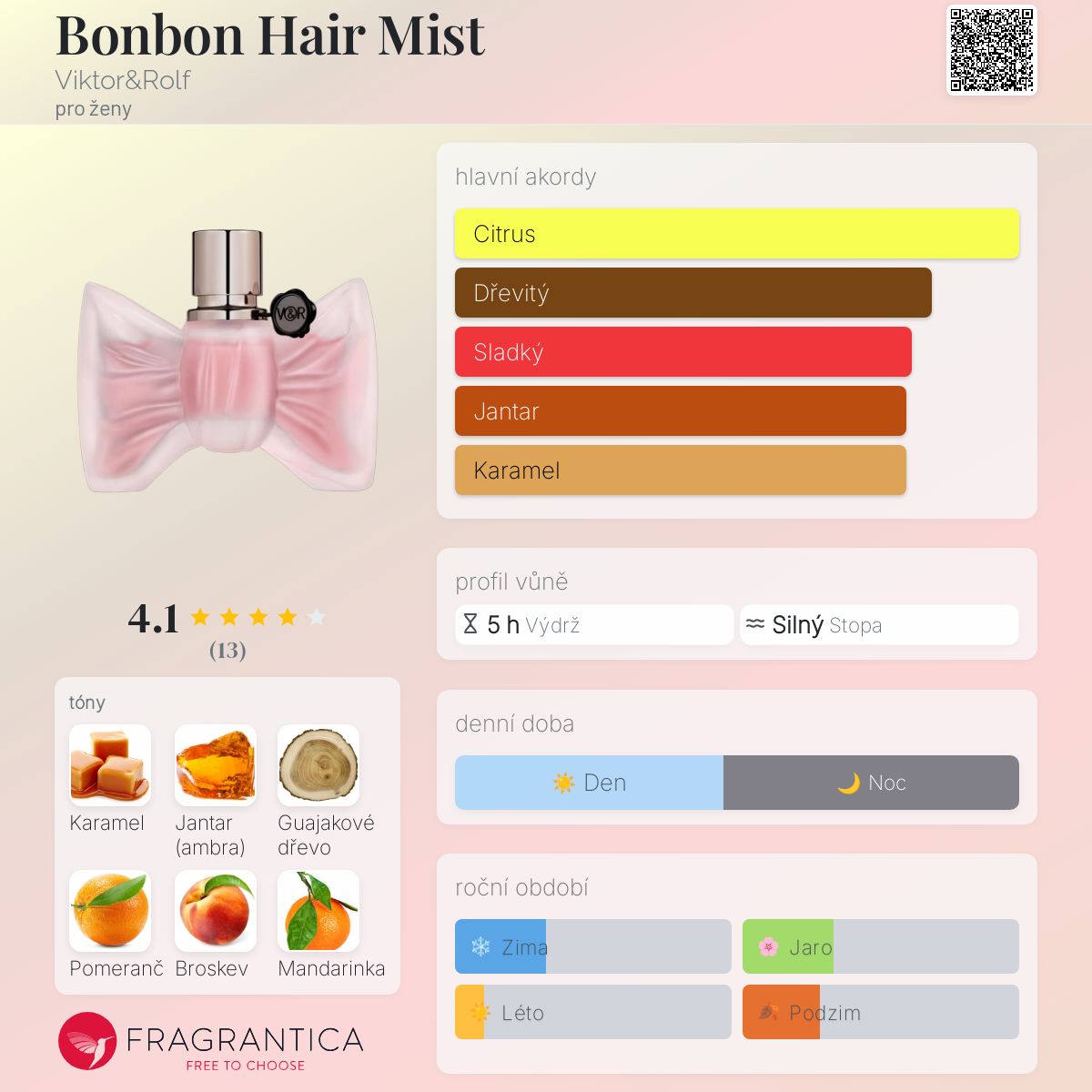 Bonbon Hair Mist podle Viktor&Rolf je Floral Fruity Gourmand vůně pro ženy. Bonbon Hair Mist byl/a uveden/a v roce 2016. Vrchní tóny jsou Pomeranč, Broskev a Mandarinka; střední tóny jsouKaramel, Pomerančový květ a Jasmín ; základní tóny jsou Jantar (ambra), Guajakové dřevo, Santalové dřevo a Cedr.