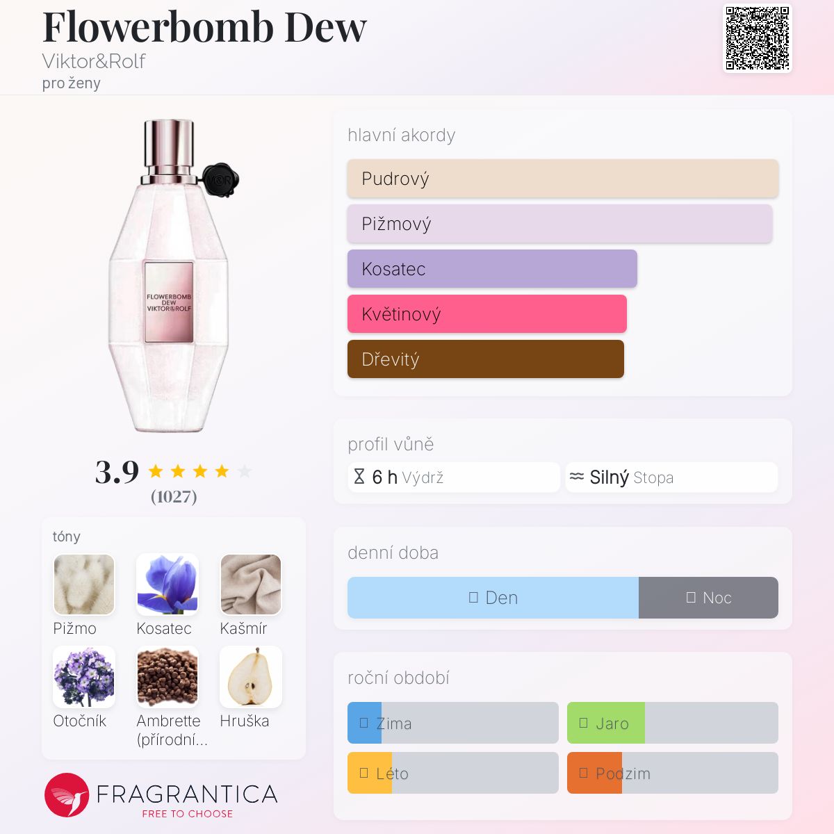 Flowerbomb Dew podle Viktor&Rolf je Floral vůně pro ženy. Flowerbomb Dew byl/a uveden/a v roce 2020. Vrchní tóny jsou Ambrette (přírodní pižmo), Hruška, Kapka rosy a Bergamot; střední tóny jsouKosatec a Růže ; základní tóny jsou Bílé pižmo, Kašmír a Otočník.