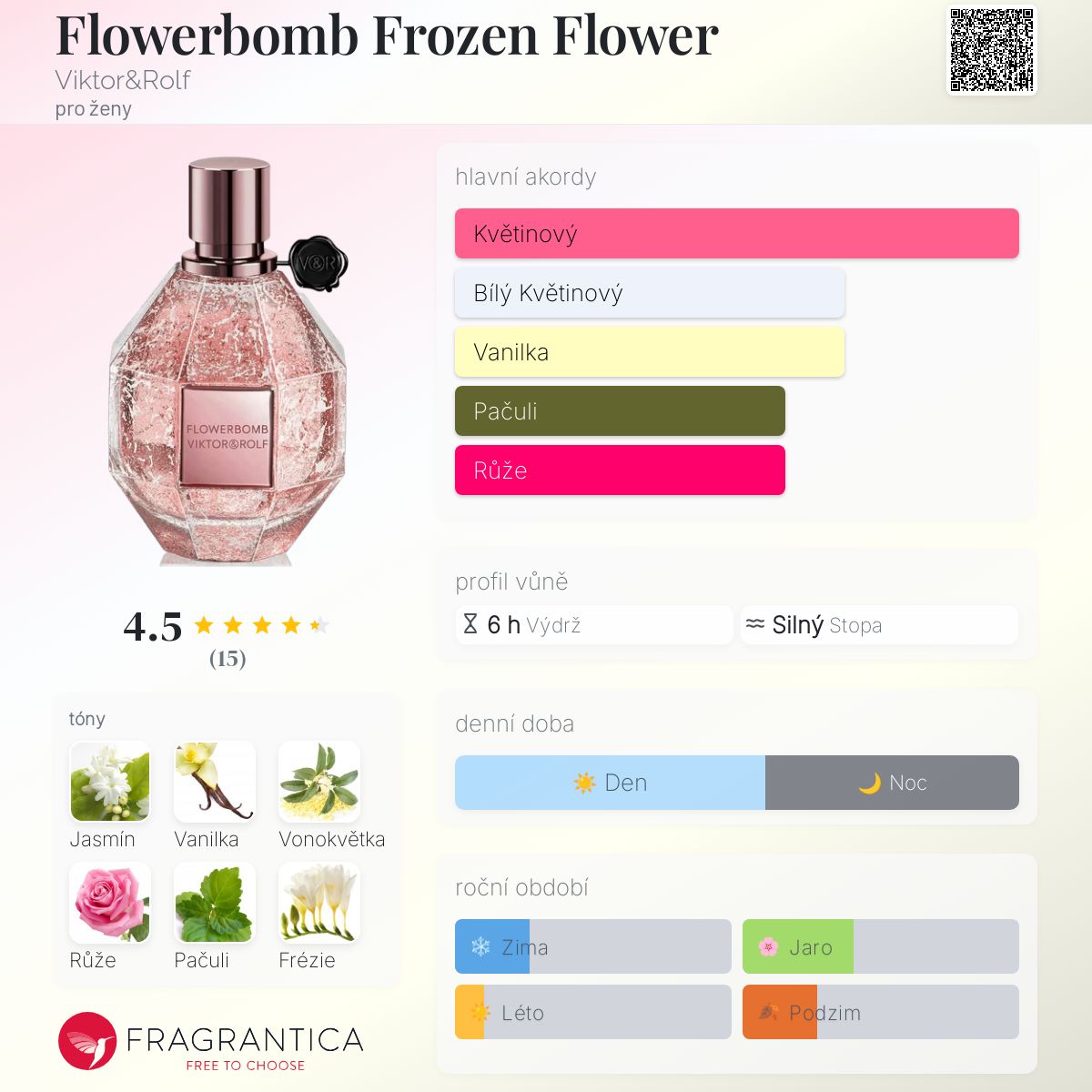 Flowerbomb Frozen Flower podle Viktor&Rolf je Orientální Floral vůně pro ženy. Toto je nová vůně. Flowerbomb Frozen Flower byl/a uveden/a v roce 2024. Vrchní tóny jsou Růže, Frézie a Orchidej; střední tóny jsouJasmín a Vonokvětka ; základní tóny jsou Vanilka a Pačuli.