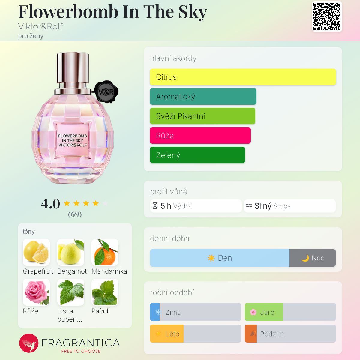 Flowerbomb In The Sky podle Viktor&Rolf je Chypre Floral vůně pro ženy. Flowerbomb In The Sky byl/a uveden/a v roce 2020. "Nosem" za touto vůní je Domitille Michalon Bertier. Vrchní tóny jsou Grapefruit, Bergamot a Mandarinka; střední tóny jsouRůže, Poupata rybízu a Konvalinka ; základní tóny jsou Pačuli a Jasmín Sambac.