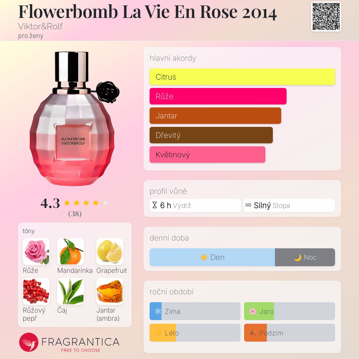 Flowerbomb La Vie En Rose 2014 podle Viktor&Rolf je Orientální Floral vůně pro ženy. Flowerbomb La Vie En Rose 2014 byl/a uveden/a v roce 2014. Vrchní tóny jsou Mandarinka, Grapefruit, Růžový pepř a Zelený čaj; střední tóny jsouRůže, Orchidej a Jasmín ; základní tóny jsou Jantar (ambra), Kašmír a Pačuli.