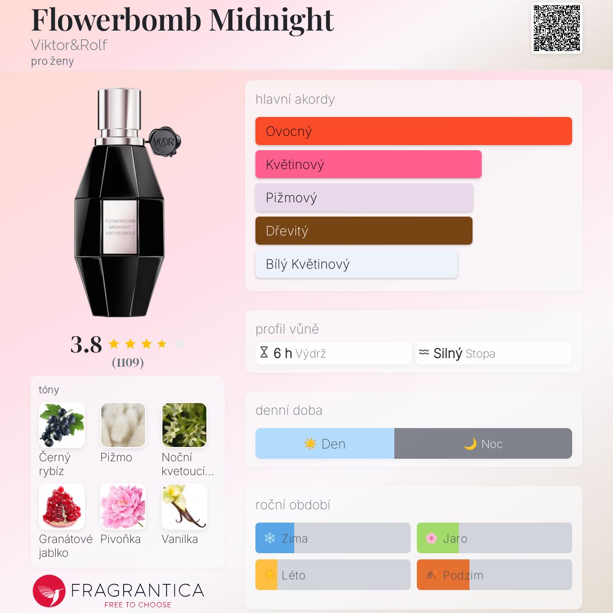 Flowerbomb Midnight podle Viktor&Rolf je Floral vůně pro ženy. Flowerbomb Midnight byl/a uveden/a v roce 2019. Flowerbomb Midnight byl/a vytvořen/a Carlos Benaïm, Fanny Bal, Dominique Ropion a Domitille Michalon Bertier. Vrchní tóny jsou Černý rybíz a Granátové jablko; střední tóny jsouNoční kvetoucí jasmín a Pivoňka ; základní tóny jsou Bílé pižmo a Vanilka.