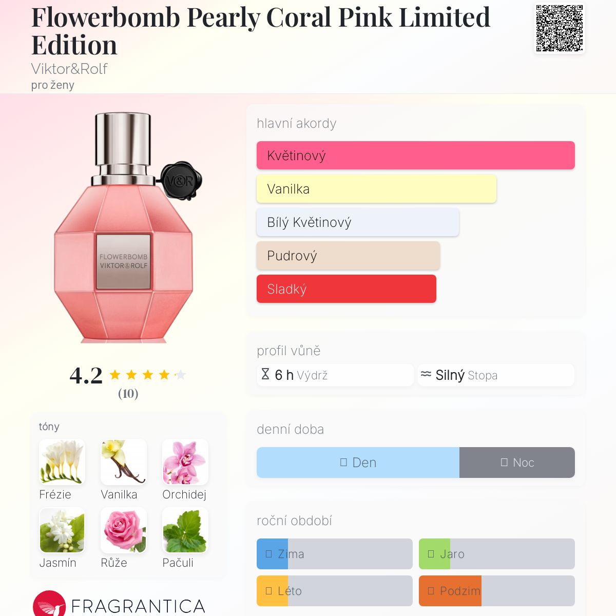Flowerbomb Pearly Coral Pink Limited Edition podle Viktor&Rolf je Floral vůně pro ženy. Flowerbomb Pearly Coral Pink Limited Edition byl/a uveden/a v roce 2021. Vrchní tóny jsou Frézie, Orchidej a Květná růže; střední tón jeJasmín Sambac ; základní tóny jsou Vanilka a Pačuli.