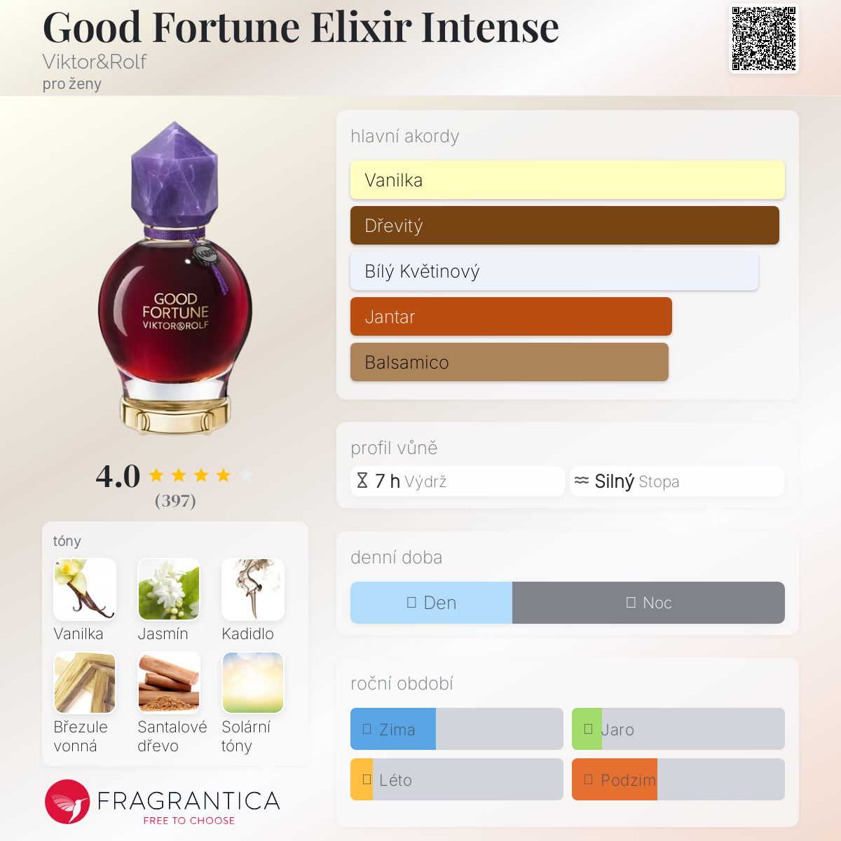 Good Fortune Elixir Intense podle Viktor&Rolf je Orientální Floral vůně pro ženy. Toto je nová vůně. Good Fortune Elixir Intense byl/a uveden/a v roce 2023. Vrchní tón je Kadidlo ; střední tóny jsouJasmín a Solární tóny ; základní tóny jsou Bourbonská vanilka, Březule vonná a Santalové dřevo.