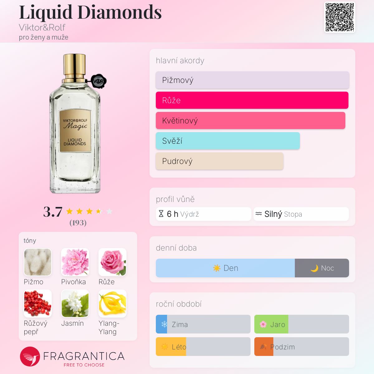 Liquid Diamonds podle Viktor&Rolf je Floral Woody Musk vůně pro ženy a muže. Liquid Diamonds byl/a uveden/a v roce 2017. "Nosem" za touto vůní je Dora Baghriche. Vrchní tón je Růžový pepř ; střední tóny jsouPivoňka, Bulharská růže, Jasmín a Ylang-Ylang ; základní tóny jsou Pižmo a Pačuli.