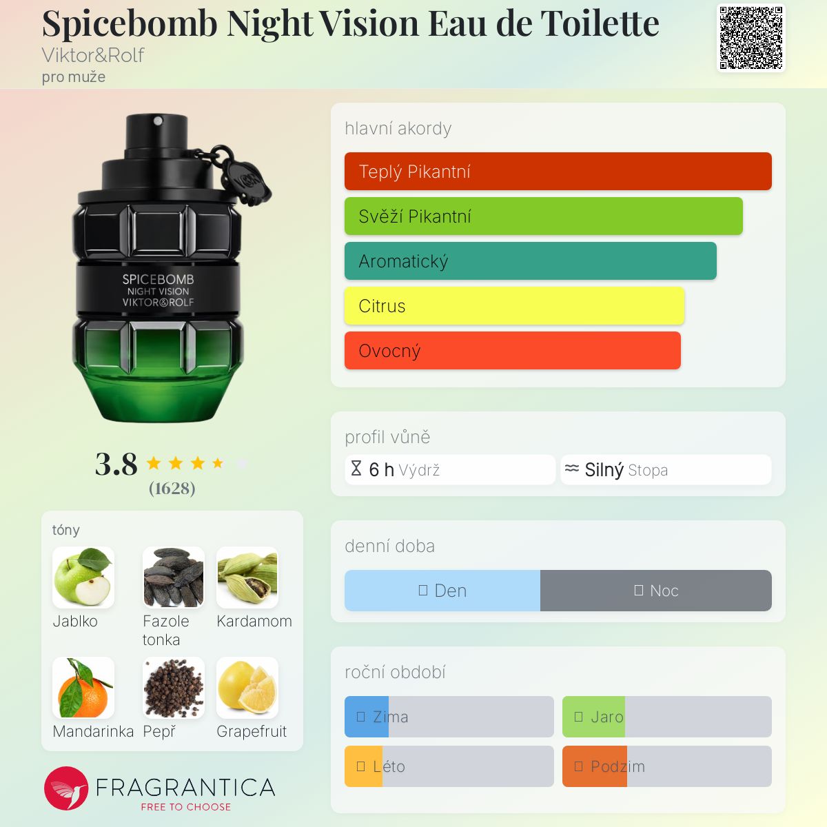 Spicebomb Night Vision Eau de Toilette podle Viktor&Rolf je Orientální Fougere vůně pro muže. Spicebomb Night Vision Eau de Toilette byl/a uveden/a v roce 2019. Spicebomb Night Vision Eau de Toilette byl/a vytvořen/a Nathalie Lorson a Pierre Negrin. Vrchní tóny jsou Granny Smith jablko, Kardamom, Zelená mandarinka a Grapefruit; střední tóny jsouPepř, Šalvěj, Muškátový oříšek, Červená chilli paprička, Hřebíček a Pelargónie ; základní tóny jsou Fazole tonka, Dřevité tóny a Mandle.