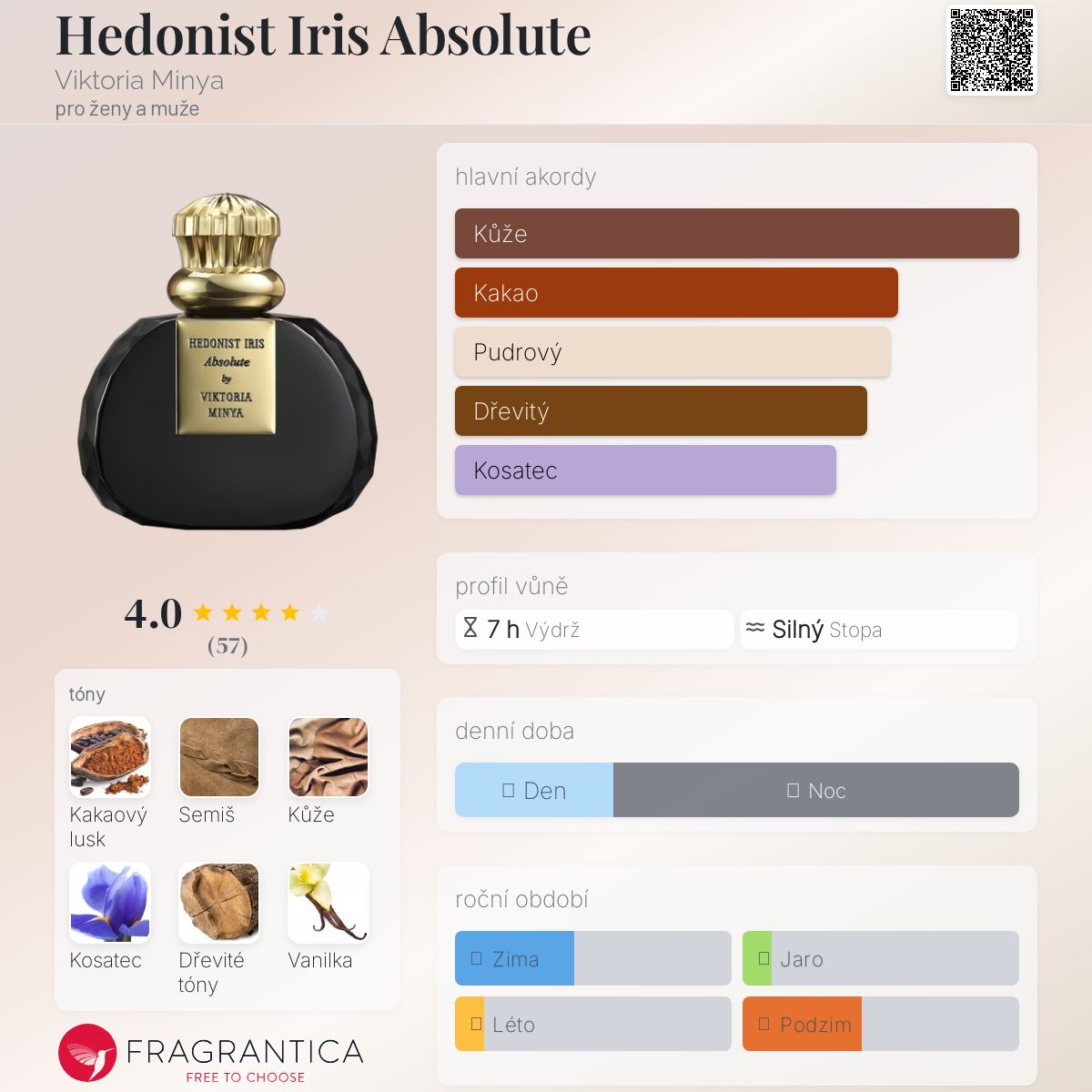 Hedonist Iris Absolute podle Viktoria Minya je Orientální Vanilla vůně pro ženy a muže. Hedonist Iris Absolute byl/a uveden/a v roce 2019. "Nosem" za touto vůní je Viktoria Minya. Vrchní tón je Kosatec ; střední tóny jsouSemiš a Kůže ; základní tóny jsou Kakao, Vzácné dřevo, Vanilka a Jantar (ambra).