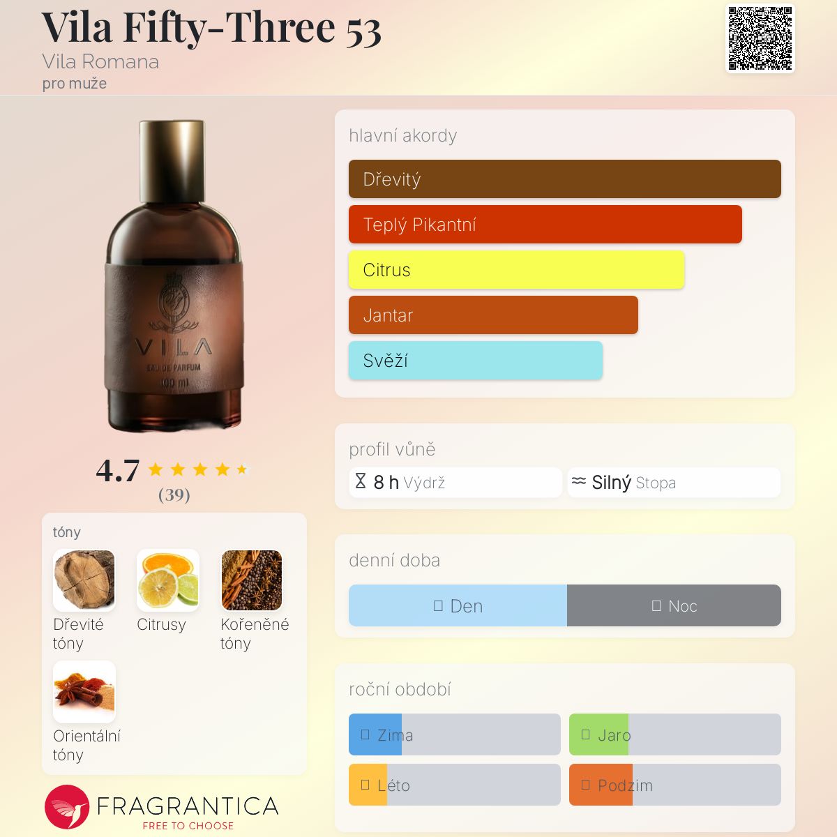 Vila Fifty-Three 53 podle Vila Romana je Woody vůně pro muže. Vila Fifty-Three 53 byl/a uveden/a v roce 2012. Vrchní tón je Citrusy ; střední tóny jsouArabské koření a Orientální tóny ; základní tón je Vzácné dřevo.