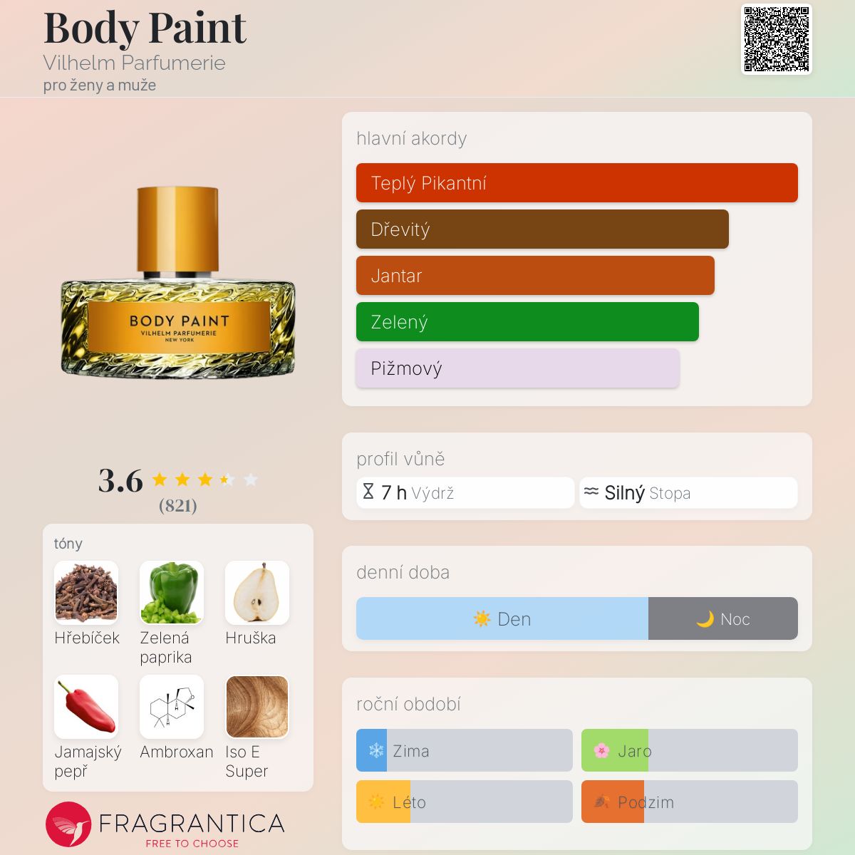 Body Paint podle Vilhelm Parfumerie je Chypre Fruity vůně pro ženy a muže. Body Paint byl/a uveden/a v roce 2020. "Nosem" za touto vůní je Marc-Antoine Corticchiato. Vrchní tóny jsou Zelená paprika, Hruška, Červená chilli paprička a Citrón; střední tóny jsouHřebíček, Iso E Super a Muškátový oříšek ; základní tóny jsou Ambroxan, Dubový mech a Cedr.