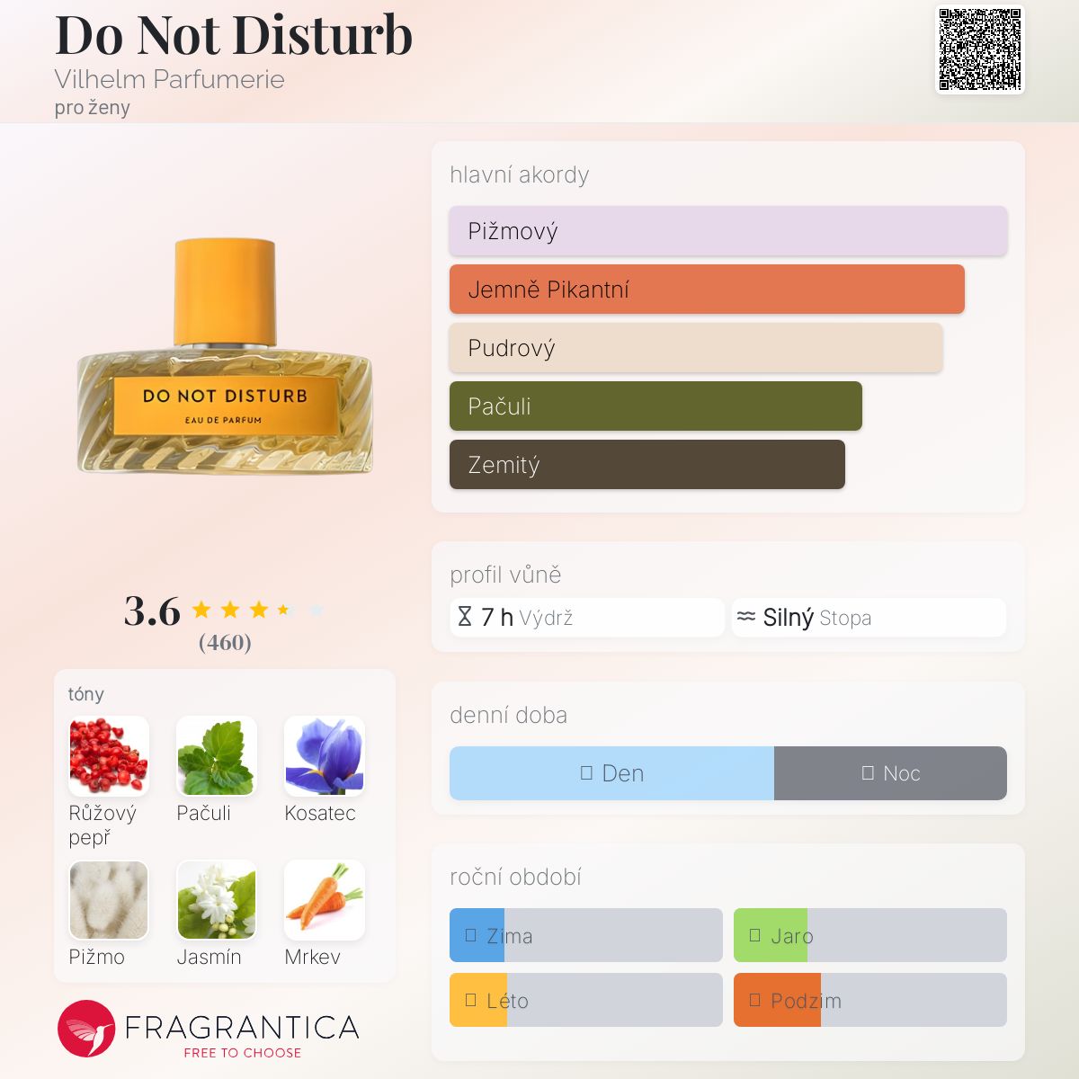 Do Not Disturb podle Vilhelm Parfumerie je Floral vůně pro ženy. Do Not Disturb byl/a uveden/a v roce 2016. "Nosem" za touto vůní je Jérôme Epinette. Vrchní tóny jsou Růžový pepř a Mrkev; střední tóny jsouKosatec a Jasmín ; základní tóny jsou Pačuli, Bílé pižmo a Ambroxan.