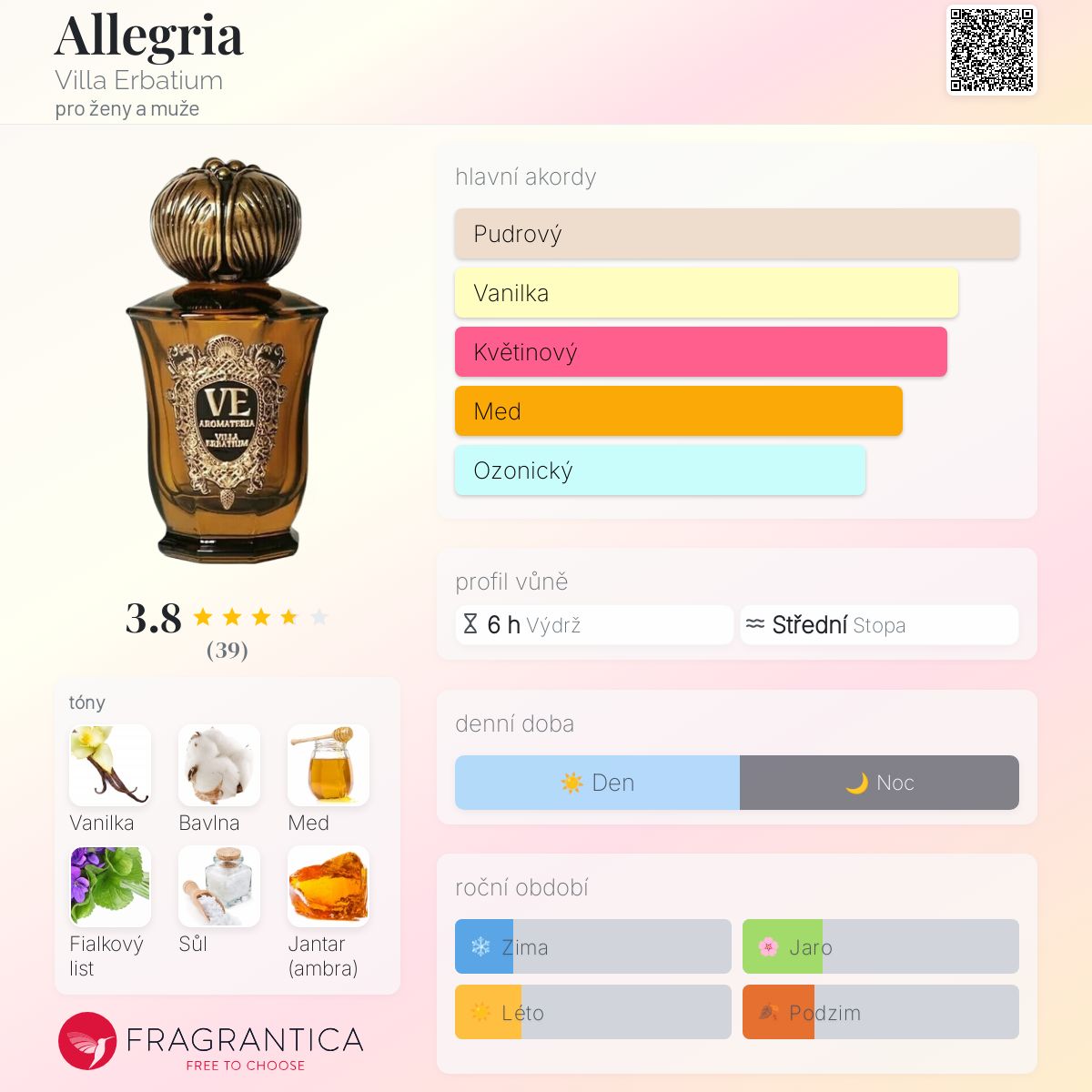 Allegria podle Villa Erbatium je Orientální Spicy vůně pro ženy a muže. Toto je nová vůně. Allegria byl/a uveden/a v roce 2024. "Nosem" za touto vůní je Ha Minseo Caterina.