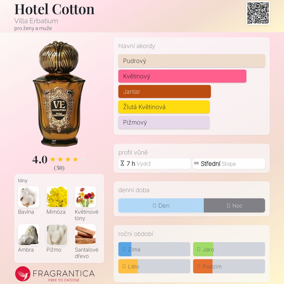 Hotel Cotton podle Villa Erbatium je Woody Floral Musk vůně pro ženy a muže. Toto je nová vůně. Hotel Cotton byl/a uveden/a v roce 2024. "Nosem" za touto vůní je Ha Minseo Caterina.