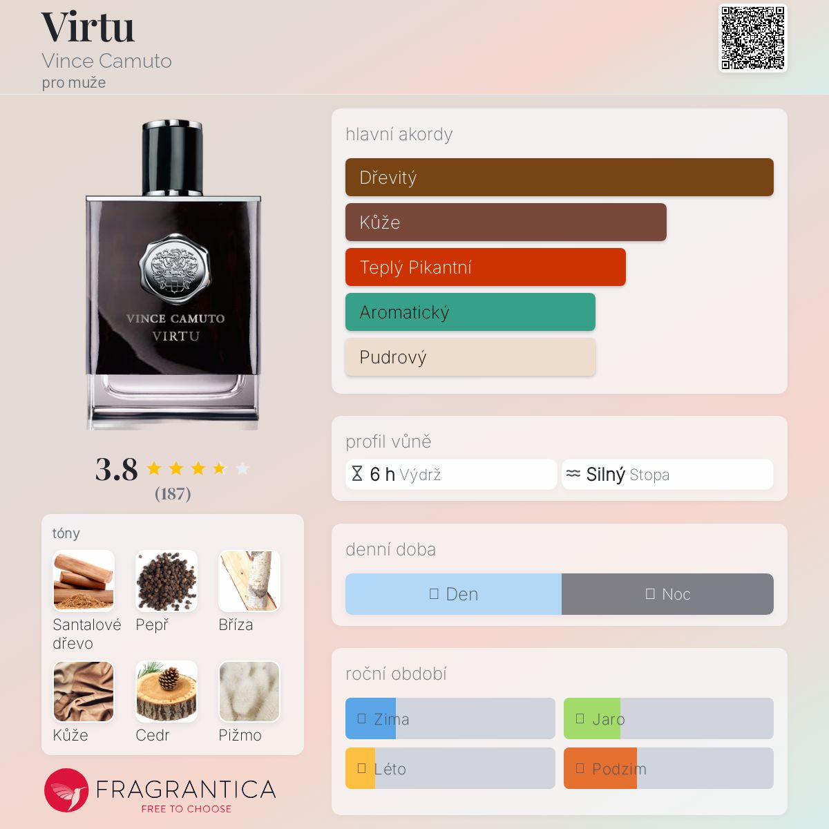 Virtu podle Vince Camuto je Leather vůně pro muže. Virtu byl/a uveden/a v roce 2018. "Nosem" za touto vůní je Laurent Le Guernec. Vrchní tóny jsou Pepř, Papyrus a Kardamom; střední tóny jsouBříza, Haitský vetiver a Mech ; základní tóny jsou Santalové dřevo, Kůže, Cedr a Pižmo.