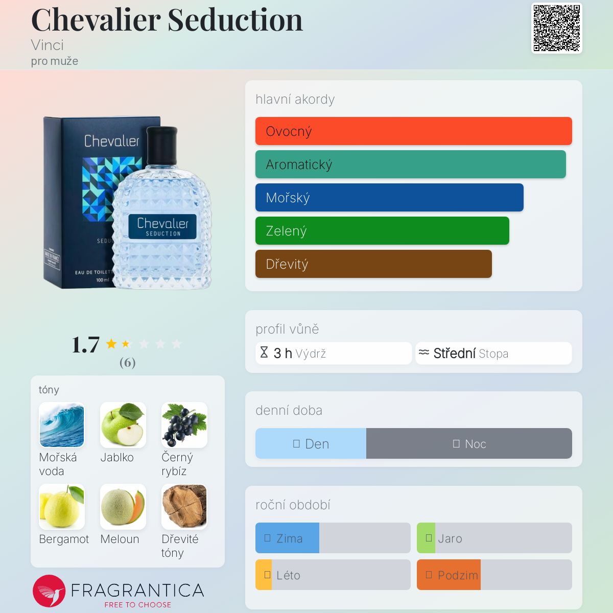 Chevalier Seduction podle Vinci je Aromatic Aquatic vůně pro muže. Toto je nová vůně. Chevalier Seduction byl/a uveden/a v roce 2024. "Nosem" za touto vůní je Givaudan. Vrchní tóny jsou Černý rybíz, Bergamot, Meloun a Máta; střední tóny jsouMořská voda, Zelené jablko, Cappuccino a Kardamom ; základní tóny jsou Dřevité tóny a Jantar (ambra).