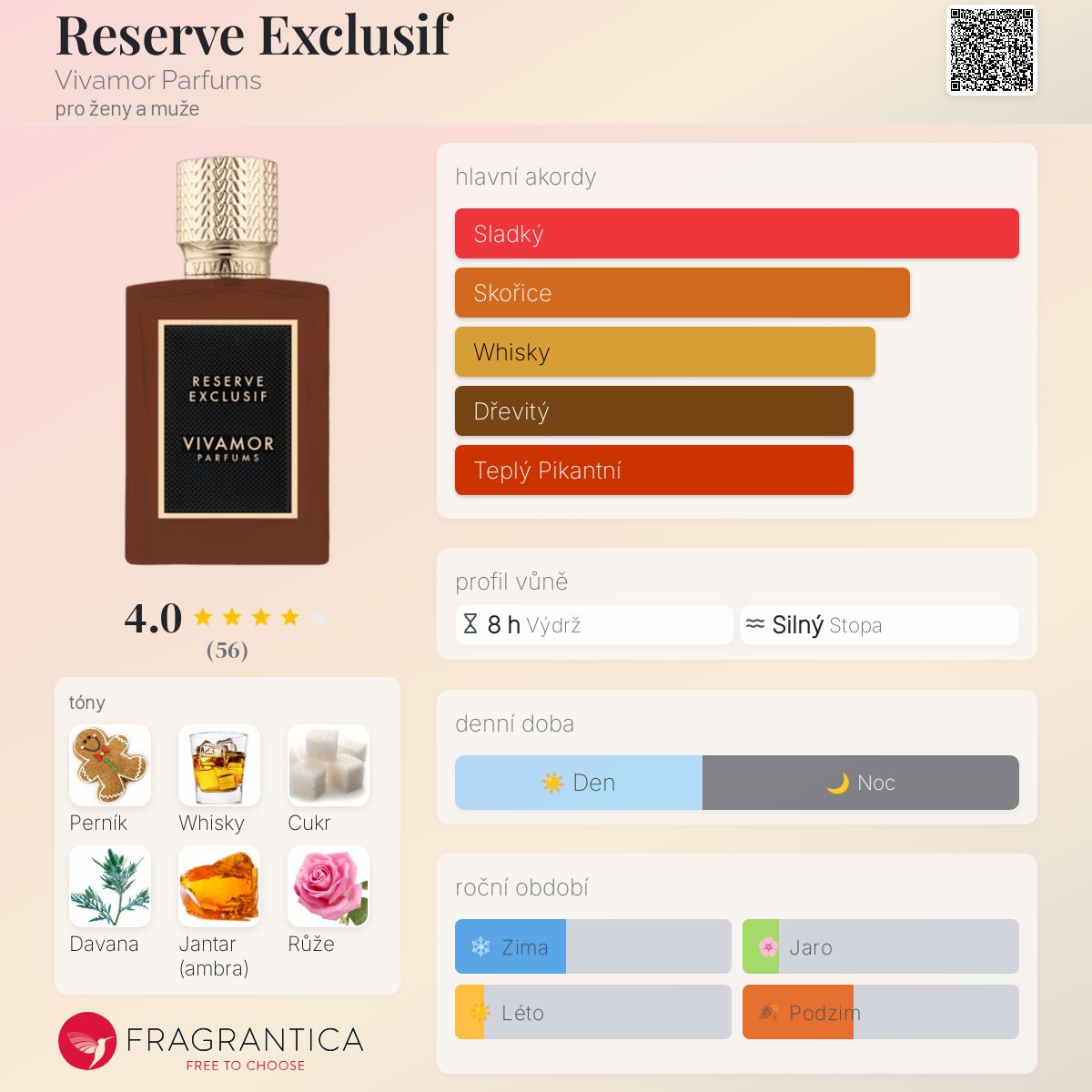 Vivamor Parfums Reserve Exclusif je hladká, sladká a kořeněná směs a možná nejsnadnější vůně z řady, kterou jsem zatím vyzkoušela, jakási prašná, sametová směs vrchních tónů, které popisuji jako perník a pražený kokosový cukr, které se táhnou přes whisky, růži a hlavně dřeva. Stejně jako u některých dalších položek této řady je sladká, ale ne strašně sladká, gurmánsky laděná, a přitom ne úplně gurmánská, a je ohleduplně namíchaná. Má trochu kandovaný nádech, který vychází z vrchních tónů, ale je také posílen růží a whisky pod nimi. Vidím, že jde o poměrně univerzální nabídku, kterou si většina může vychutnat, i když jako většina poměrně bohatých gurmánských vůní se hodí spíše do chladnějšího počasí než do tepla. Ze sedmi vůní, které jsem zatím z řady vyzkoušela, je pouze Akoya svěží ve stereotypním smyslu, ale většina nabídky, jako například Reserve Exclusif, má atributy, díky nimž je lze nosit v mnoha situacích, alespoň podle mých vlastních sezónních preferencí, například.