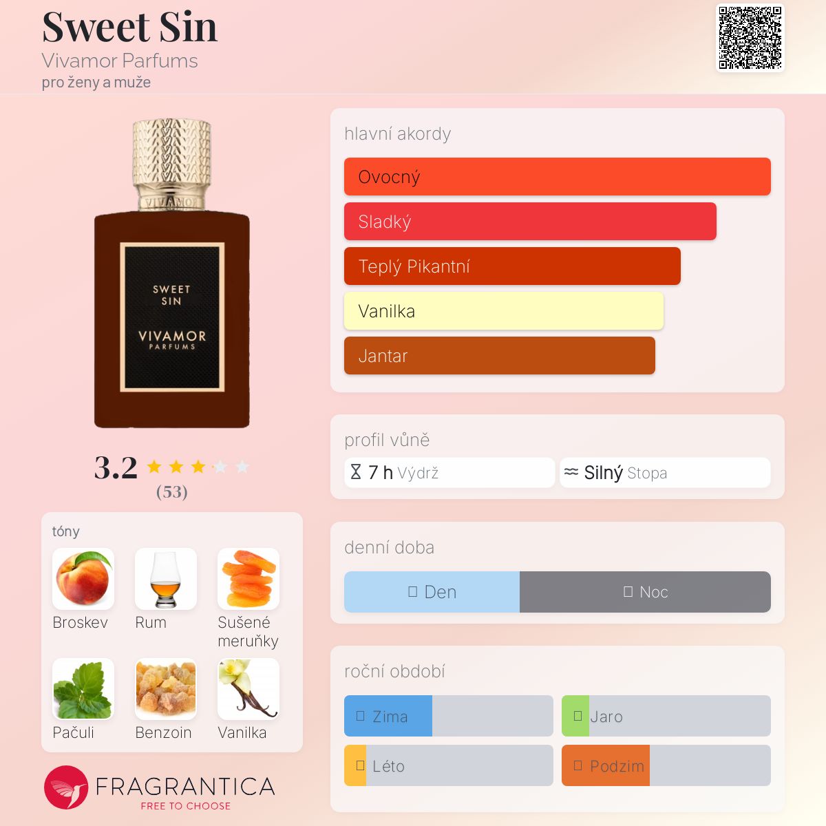 Sweet Sin podle Vivamor Parfums je Floral Fruity vůně pro ženy a muže. Sweet Sin byl/a uveden/a v roce 2023. Sweet Sin byl/a vytvořen/a Bertrand Duchaufour a Pierre Flores. Vrchní tóny jsou Broskev a Sušené meruňky; střední tóny jsouRum, Benzoin a Fazole tonka ; základní tóny jsou List indonéského pačuli, Madagaskarská vanilka a Bílé pižmo.