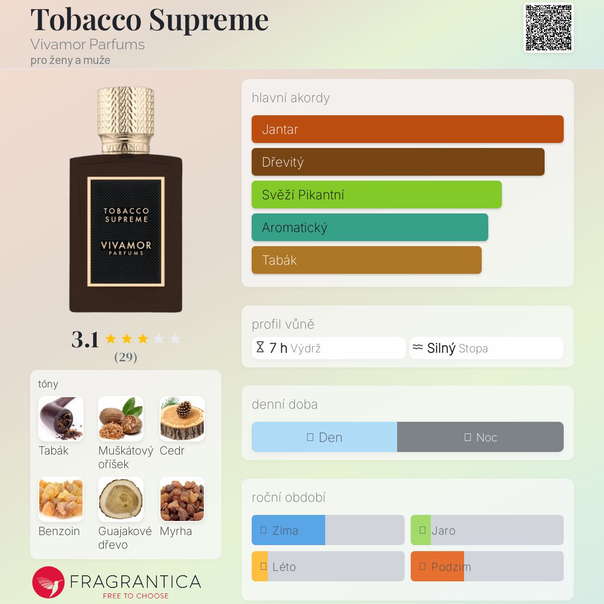 Tobacco Supreme podle Vivamor Parfums je Aromatic vůně pro ženy a muže. Tobacco Supreme byl/a uveden/a v roce 2022. "Nosem" za touto vůní je Chris Maurice. Vrchní tóny jsou Tabák, Bulharská růže a Levandule; střední tóny jsouMuškátový oříšek, Šalvěj muškátová, Jantar (ambra) a Pelargónie ; základní tóny jsou Atlasový cedr, Siamský (thajský) benzoin, Guajakové dřevo, Myrha, Vanilka a Fazole tonka.