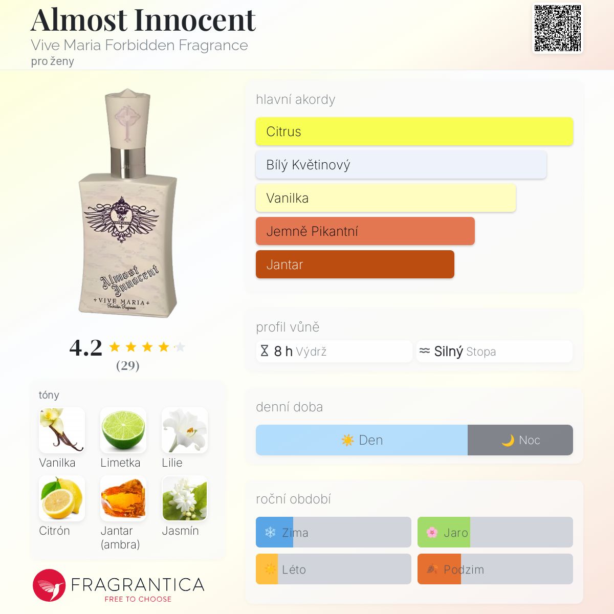 Almost Innocent podle Vive Maria Forbidden Fragrance je vůně pro ženy. Almost Innocent byl/a uveden/a v roce 2007. Vrchní tóny jsou Limetka, Citrón a Růžový pepř; střední tóny jsouLilie, Jasmín a Magnólie ; základní tóny jsou Vanilka, Jantar (ambra) a Cedr.