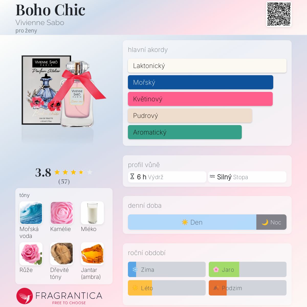 Boho Chic podle Vivienne Sabo je Floral Woody Musk vůně pro ženy. Vrchní tóny jsou Mořská voda, Citrusy a Jablko; střední tóny jsouKamélie, Růže a Dřevité tóny ; základní tóny jsou Mléko, Jantar (ambra) a Pižmo.