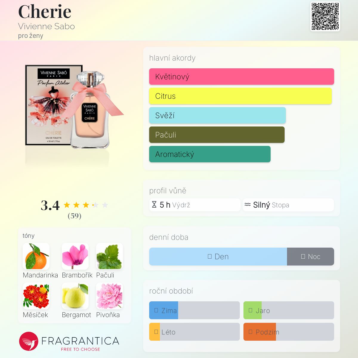 Cherie podle Vivienne Sabo je Floral Woody Musk vůně pro ženy. Vrchní tóny jsou Mandarinka, Aksamitník a Bergamot; střední tóny jsouBrambořík, Pivoňka a Jasmín ; základní tóny jsou Pačuli a Vetiver.
