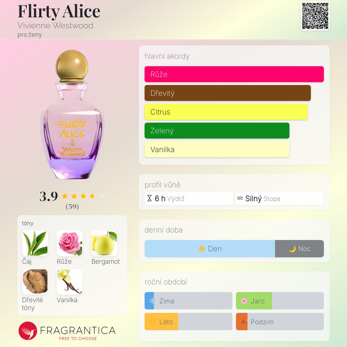 Flirty Alice podle Vivienne Westwood je Floral vůně pro ženy. Flirty Alice byl/a uveden/a v roce 2013. Vrchní tóny jsou Zelený čaj a Bergamot; střední tón jeRůže ; základní tóny jsou Bílé dřevo a Vanilka.