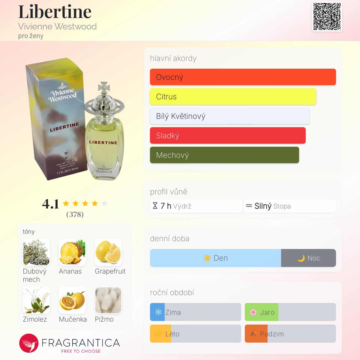 Libertine podle Vivienne Westwood je Chypre Fruity vůně pro ženy. Libertine byl/a uveden/a v roce 2000. "Nosem" za touto vůní je Martin Gras. Vrchní tóny jsou Ananas, Grapefruit a Mučenka; střední tóny jsouZimolez, Bergamot, Konvalinka a Růže ; základní tóny jsou Dubový mech, Pižmo, Pačuli, Labdanum a Jantar (ambra).