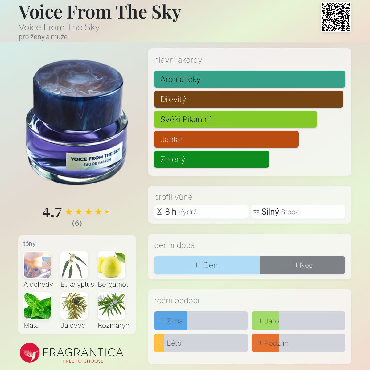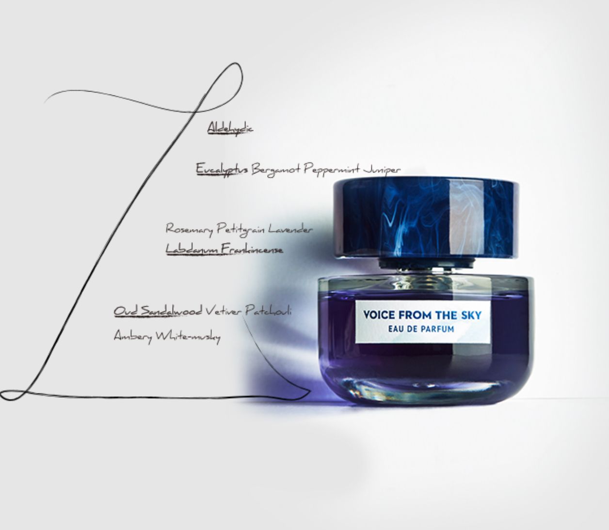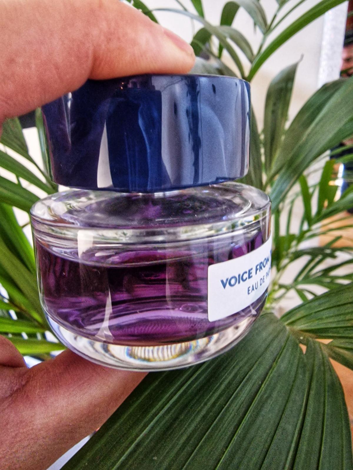 Voice From The Sky podle Voice From The Sky je vůně pro ženy a muže. "Nosem" za touto vůní je Tianle Feng. Vrchní tóny jsou Aldehydy, Eukalyptus, Bergamot, Máta a Jalovec; střední tóny jsouRozmarýn, Petitgrain, Levandule, Labdanum a Olibanum ; základní tóny jsou Agarové dřevo (oud), Santalové dřevo, Vetiver, Pačuli, Jantar (ambra) a Bílé pižmo.