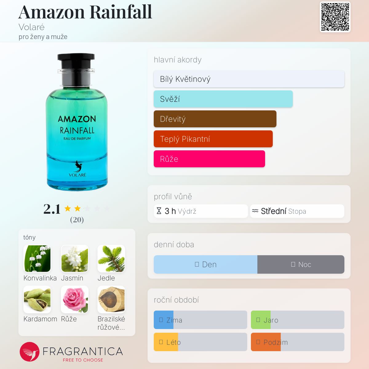 Amazon Rainfall podle Volaré je vůně pro ženy a muže. Amazon Rainfall byl/a uveden/a v roce 2024. Vrchní tóny jsou Jedle, Kardamom, Mořské tóny, Petitgrain, Citrón a Pomeranč; střední tóny jsouKonvalinka, Jasmín, Růže, Šalvěj a Rozmarýn ; základní tóny jsou Brazilské růžové dřevo, Pižmo, Vetiver a Dubový mech.