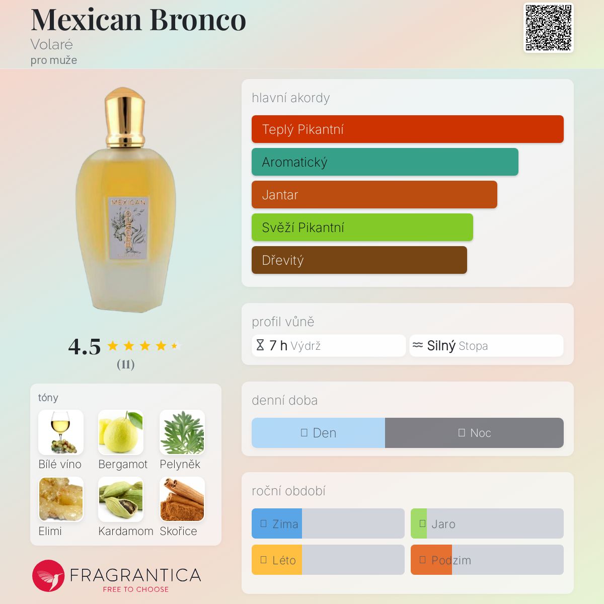 Mexican Bronco podle Volaré je vůně pro muže. Mexican Bronco byla spuštěna během 2020. Vrchní tóny jsou Bílé víno, Bergamot, Pelyněk a Elimi; střední tóny jsouKardamom, Skořice, Hřebíček a Kosatec ; základní tóny jsou Kadidlo, Dřevité tóny, Ambra a Med.