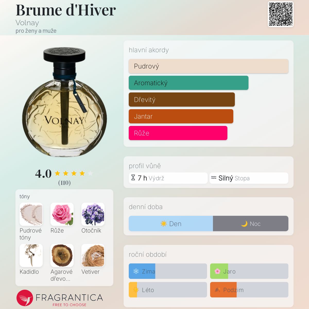 Brume d'Hiver podle Volnay je Orientální Woody vůně pro ženy a muže. Brume d'Hiver byl/a uveden/a v roce 2013. "Nosem" za touto vůní je Amelie Bourgeois. Vrchní tóny jsou Jalovcové bobulky, Elimi a Bergamot; střední tóny jsouBulharská růže, Růže a Jasmín ; základní tóny jsou Pudrové tóny, Růže, Otočník, Kadidlo, Agarové dřevo (oud), Haitský vetiver, Fialka, Pižmo, Španělské labdanum, Hřebíček a Vanilka.
