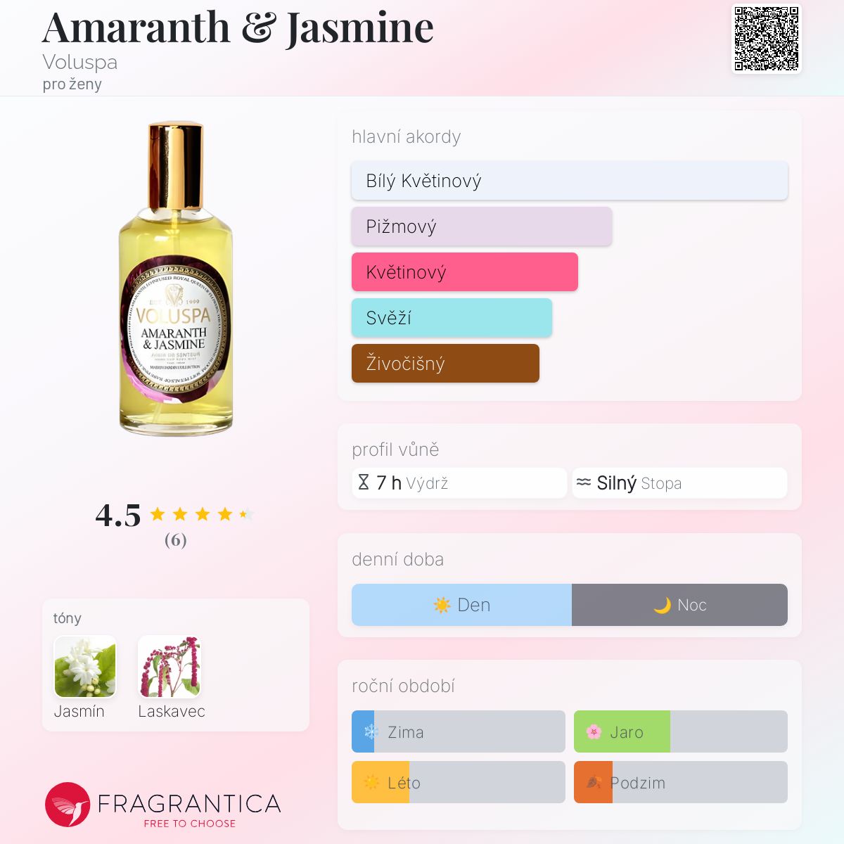 Amaranth & Jasmine podle Voluspa je Floral vůně pro ženy. Amaranth & Jasmine byl/a uveden/a v roce 2014.