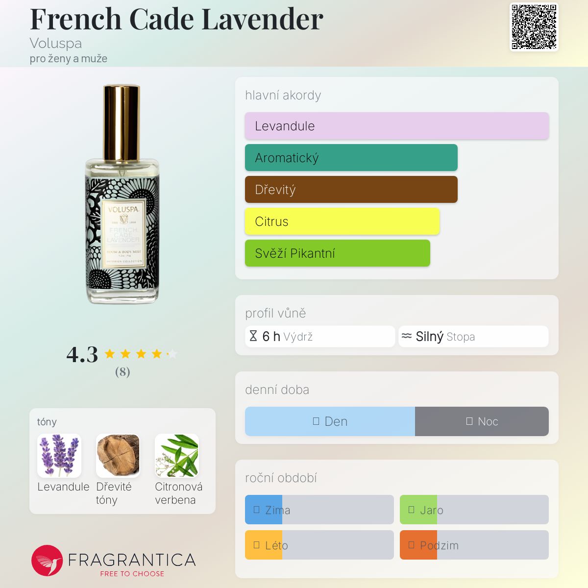 French Cade Lavender podle Voluspa je Woody Aquatic vůně pro ženy a muže. French Cade Lavender byl/a uveden/a v roce 2009.
