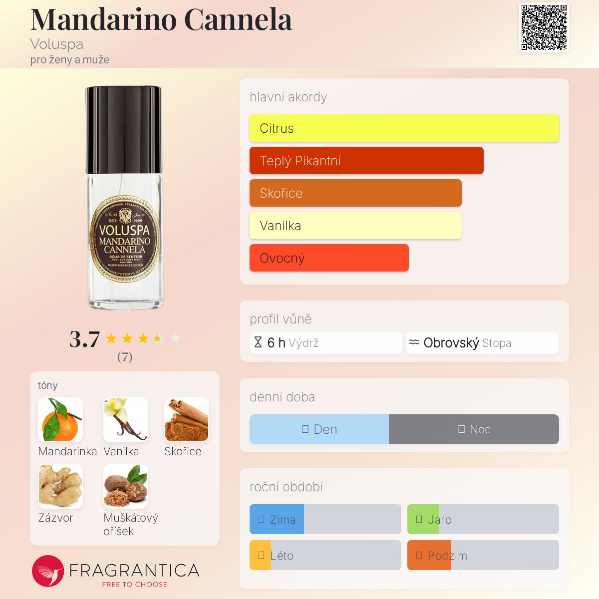 Mandarino Cannela podle Voluspa je Citrus Aromatic vůně pro ženy a muže. Mandarino Cannela byl/a uveden/a v roce 2010. Vrchní tón je Italská mandarinka ; střední tóny jsouVanilka a Skořice ; základní tóny jsou Zázvor a Muškátový oříšek.