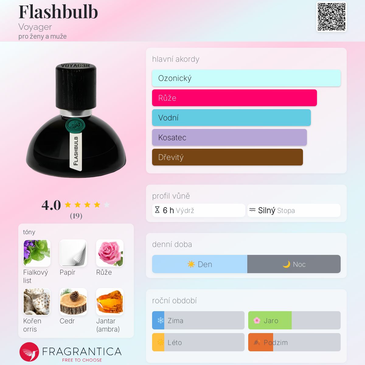 Flashbulb podle Voyager je Floral vůně pro ženy a muže. Toto je nová vůně. Flashbulb byl/a uveden/a v roce 2025. Vrchní tóny jsou Růže a Kořen orris; střední tóny jsouFialkový list a Papír ; základní tóny jsou Cedr a Jantar (ambra).
