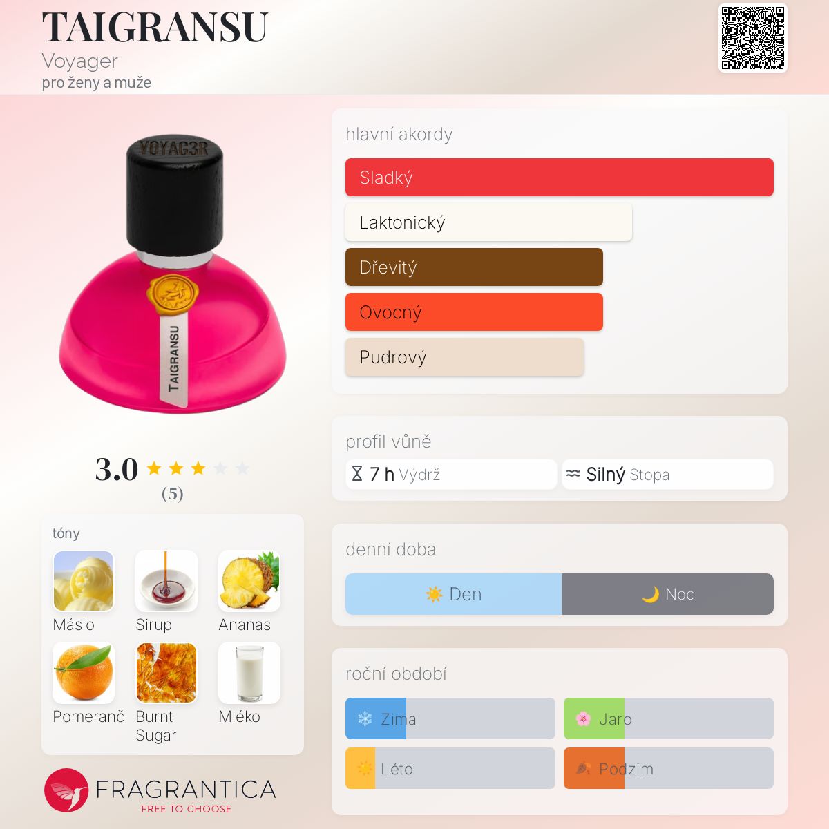 TAIGRANSU podle Voyager je Orientální Vanilla vůně pro ženy a muže. Toto je nová vůně. TAIGRANSU byl/a uveden/a v roce 2025. "Nosem" za touto vůní je Nutt Wesshasartar. Vrchní tóny jsou Ananas a Sladký pomeranč; střední tóny jsouMáslo, Sirup, Spálený cukr, Mléko a Kukuřice ; základní tóny jsou Santalové dřevo, Kašmír a Vanilka.