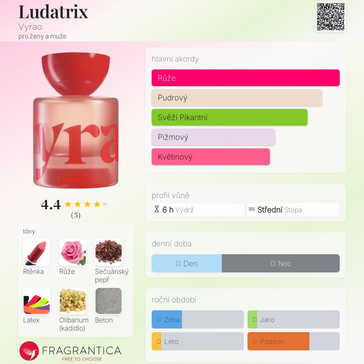 Ludatrix podle Vyrao je Orientální Spicy vůně pro ženy a muže. Toto je nová vůně. Ludatrix byl/a uveden/a v roce 2025. "Nosem" za touto vůní je Meabh McCurtin. Vrchní tóny jsou Rtěnka, Sečuánský pepř a Ambrette (přírodní pižmo); střední tóny jsouRůže, Latex, Kadidlo, Beton a Orris ; základní tóny jsou Cedr, Pižmo a Santalové dřevo.