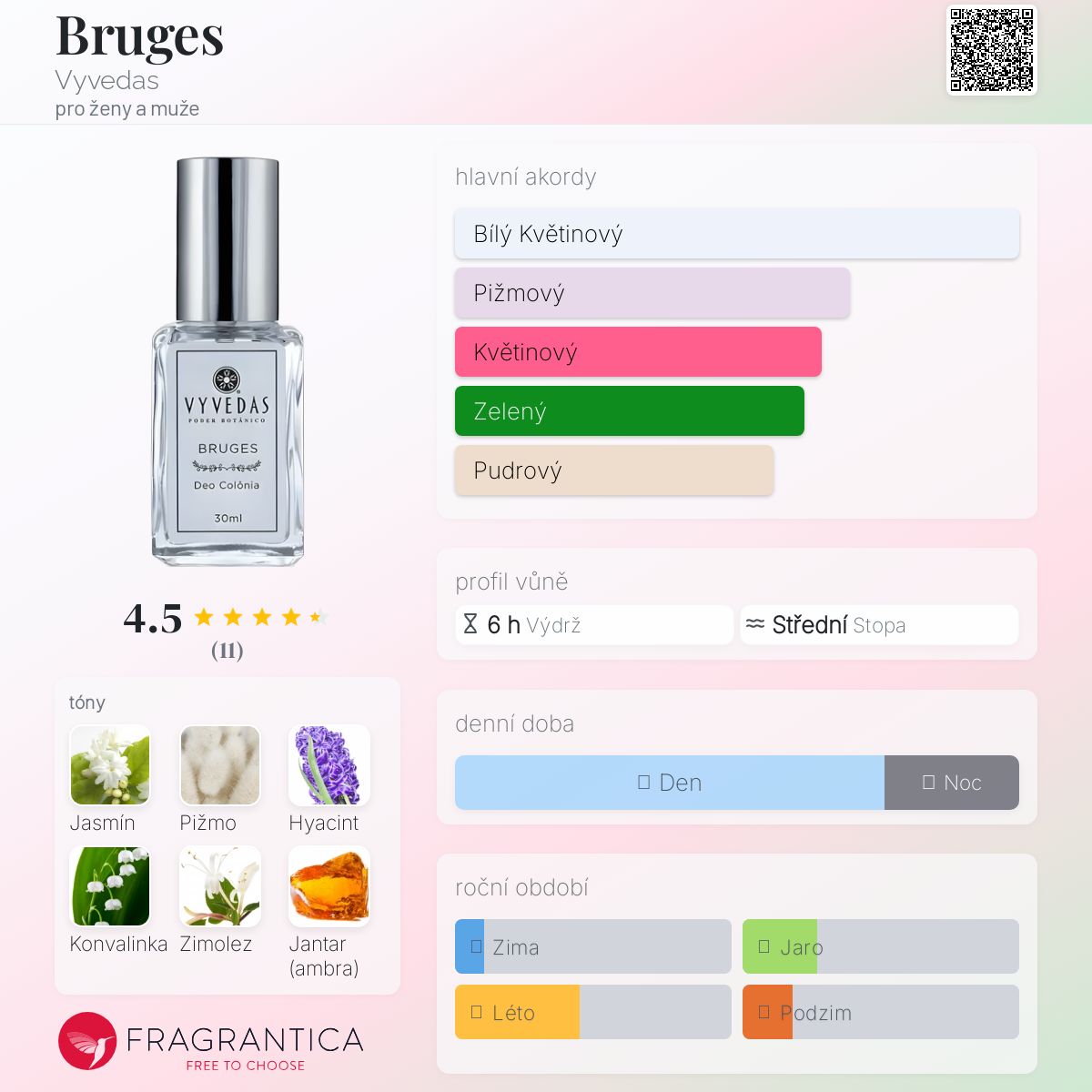 Bruges podle Vyvedas je Floral vůně pro ženy a muže. Bruges byl/a uveden/a v roce 2019. "Nosem" za touto vůní je Christine Nagel. Vrchní tóny jsou Modrý hyacint a Zimolez; střední tóny jsouJasmín a Konvalinka ; základní tóny jsou Pižmo a Jantar (ambra).