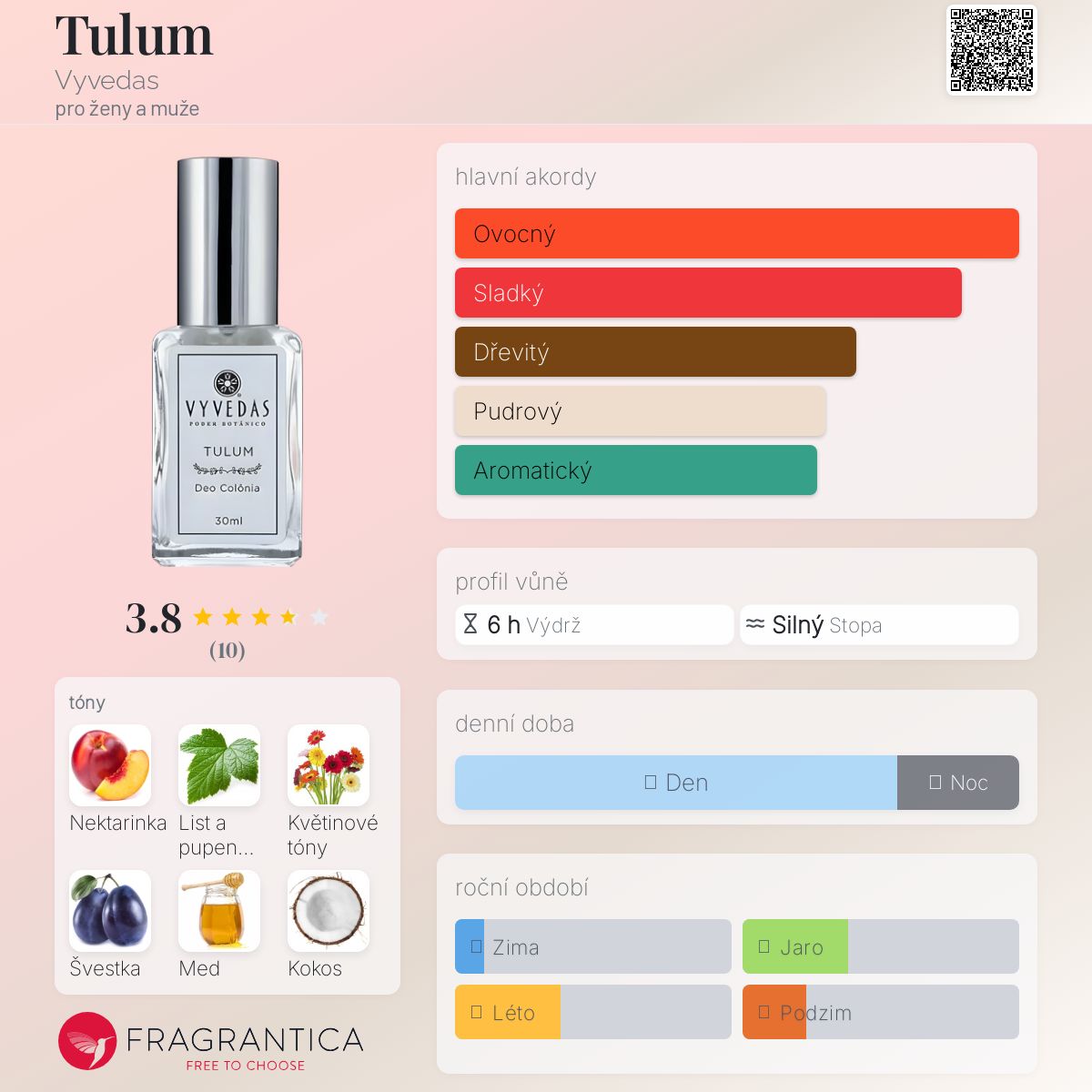 Tulum podle Vyvedas je Floral Fruity vůně pro ženy a muže. Tulum byl/a uveden/a v roce 2019. "Nosem" za touto vůní je Christine Nagel. Vrchní tóny jsou Černý rybíz a Květinové tóny; střední tóny jsouNektarinka, Švestka a Med ; základní tóny jsou Kokos, Broskev, Santalové dřevo a Vetiver.