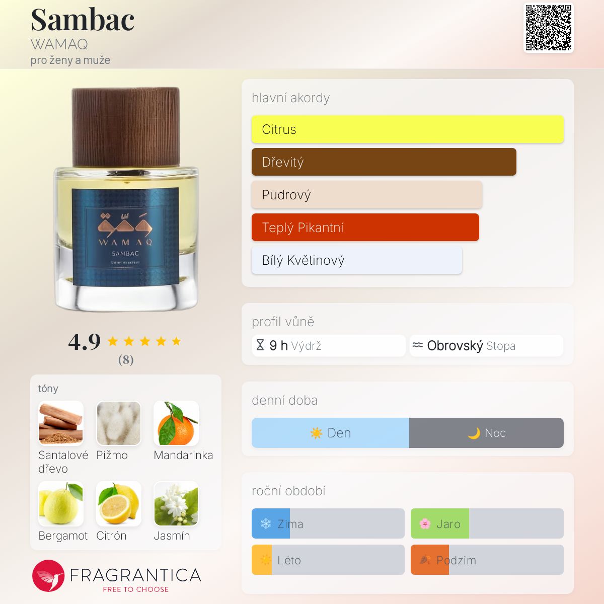 Sambac podle WAMAQ je Floral Woody Musk vůně pro ženy a muže. Toto je nová vůně. Sambac byl/a uveden/a v roce 2024. "Nosem" za touto vůní je Amer Alradhi. Vrchní tóny jsou Zelená mandarinka, Bergamot, Citrón a Hřebíček; střední tóny jsouJasmín Sambac, Pomerančový květ, Zelený čaj, Kardamom a Růže ; základní tóny jsou Santalové dřevo, Pižmo a Haitský vetiver.