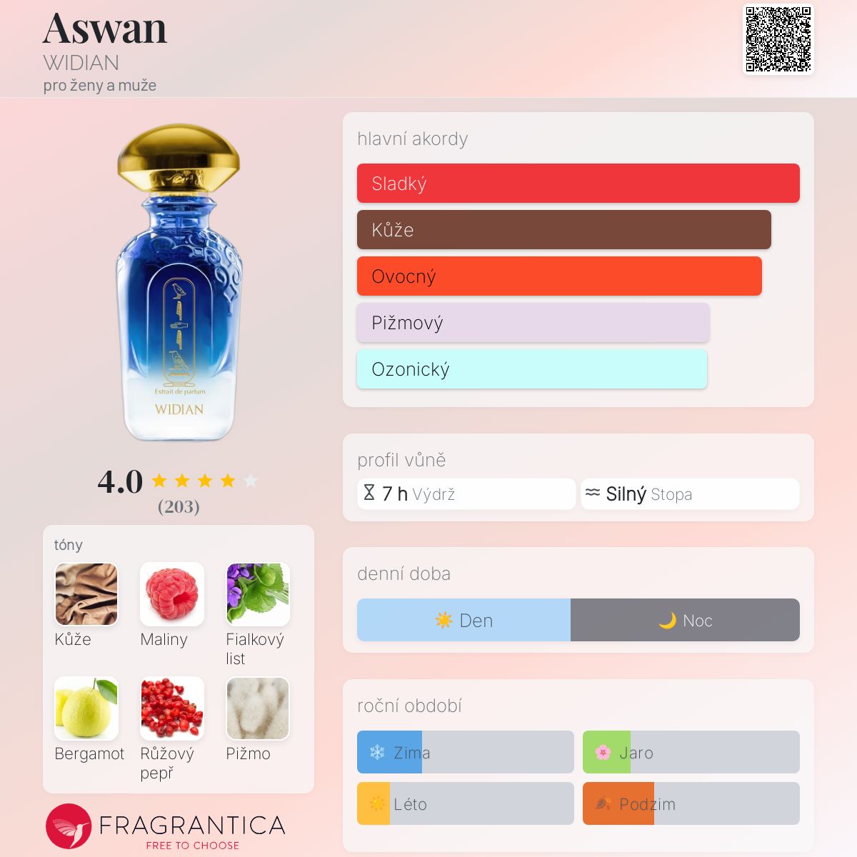 Aswan podle WIDIAN je Woody Floral Musk vůně pro ženy a muže. Aswan byl/a uveden/a v roce 2021. Vrchní tóny jsou Maliny, Bergamot a Růžový pepř; střední tóny jsouFialkové listy, Virginský cedr a Ambrofix™ ; základní tóny jsou Kůže, Pižmo, Tabák, Pačuli, Vanilka a Kumarin.