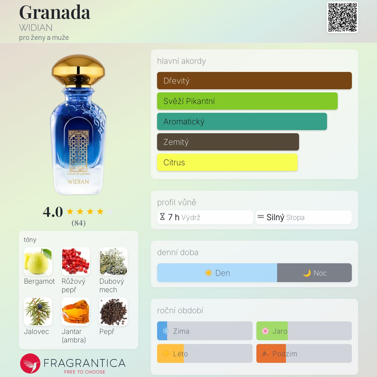 Granada podle WIDIAN je vůně pro ženy a muže. Granada byl/a uveden/a v roce 2023. "Nosem" za touto vůní je Hamid Merati-Kashani. Vrchní tóny jsou Bergamot, Růžový pepř, Černý pepř a Maliny; střední tóny jsouJalovec, Skořice, Cedr a Růže ; základní tóny jsou Dubový mech, Jantar (ambra), Pačuli, Vetiver, Pižmo a Labdanum.