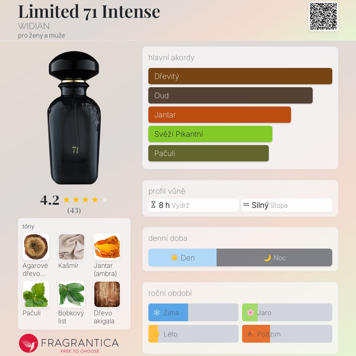 Limited 71 Intense podle WIDIAN je Orientální Fougere vůně pro ženy a muže. Limited 71 Intense byl/a uveden/a v roce 2020. Vrchní tóny jsou Bergamot, Šalvěj a Levandule; střední tóny jsouKašmír, Jantar (ambra), Bobkový list a Dřevo akigala ; základní tóny jsou Agarové dřevo (oud), Pačuli, Jantar (ambra) a Vetiver.