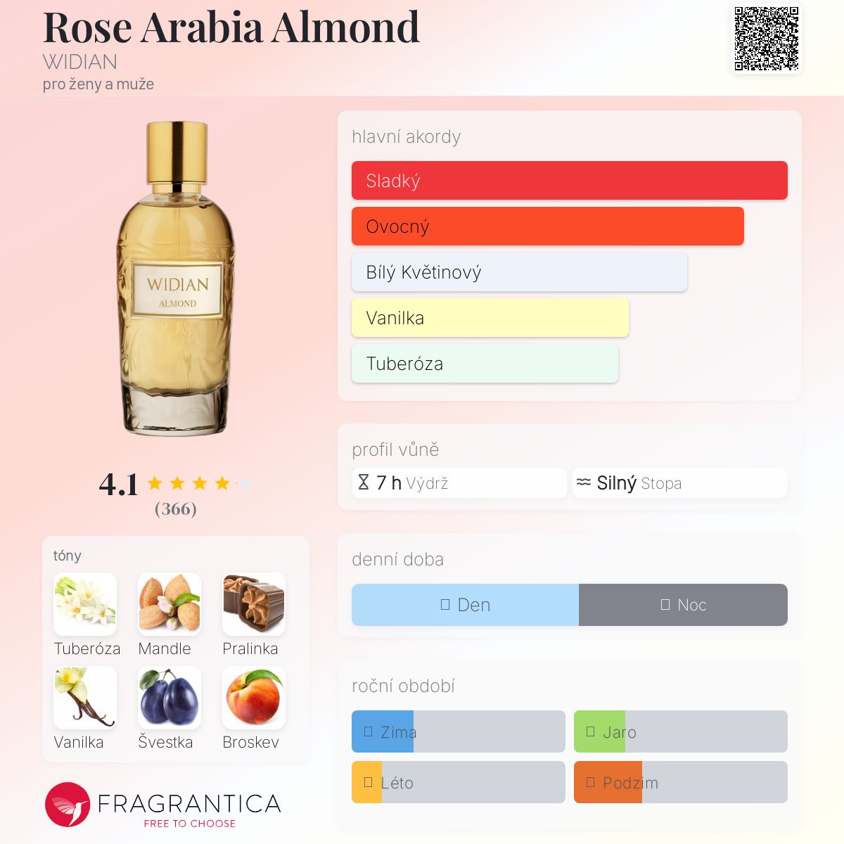 Rose Arabia Almond podle WIDIAN je Orientální Floral vůně pro ženy a muže. Rose Arabia Almond byl/a uveden/a v roce 2019. Vrchní tóny jsou Mandle, Švestka, Broskev, Maliny, Kokos, Růžový pepř a Mandarinka; střední tóny jsouTuberóza, Orchidej, Zimolez, Pomerančový květ a Fialka ; základní tóny jsou Pralinka, Vanilka, Siamský (thajský) benzoin, Pižmo, Ambrette (přírodní pižmo) a Pačuli.