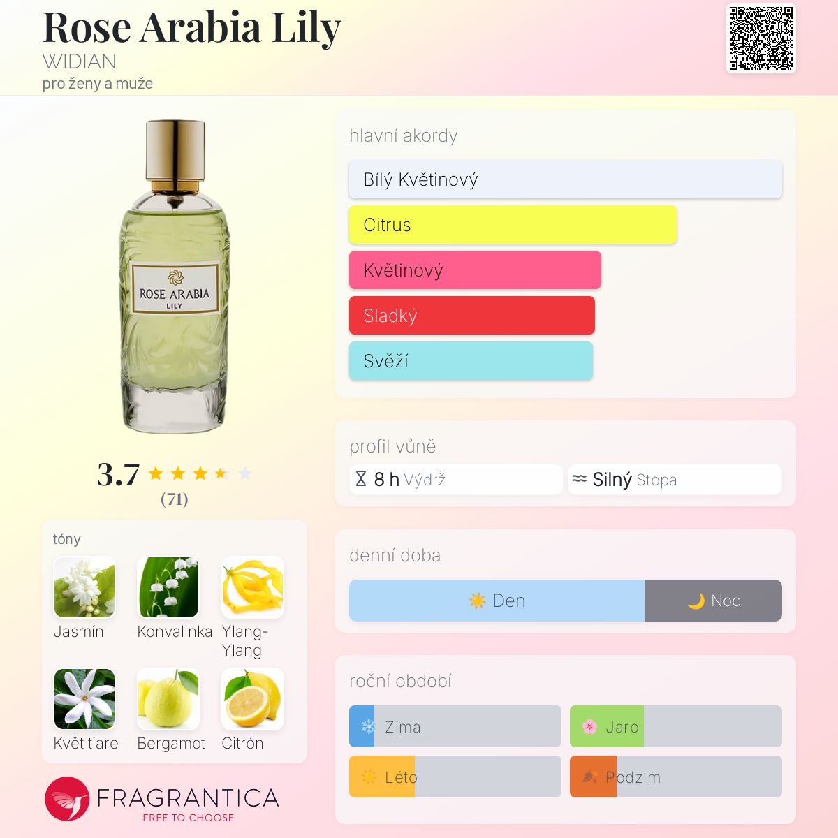 Rose Arabia Lily podle WIDIAN je Floral vůně pro ženy a muže. Rose Arabia Lily byl/a uveden/a v roce 2019. Vrchní tóny jsou Bergamot, Citrón, Mandarinka a Růžový pepř; střední tóny jsouJasmín, Konvalinka, Ylang-Ylang, Květ tiare a Karafiát ; základní tóny jsou Ambra, Pižmo, Pačuli a Vanilka.