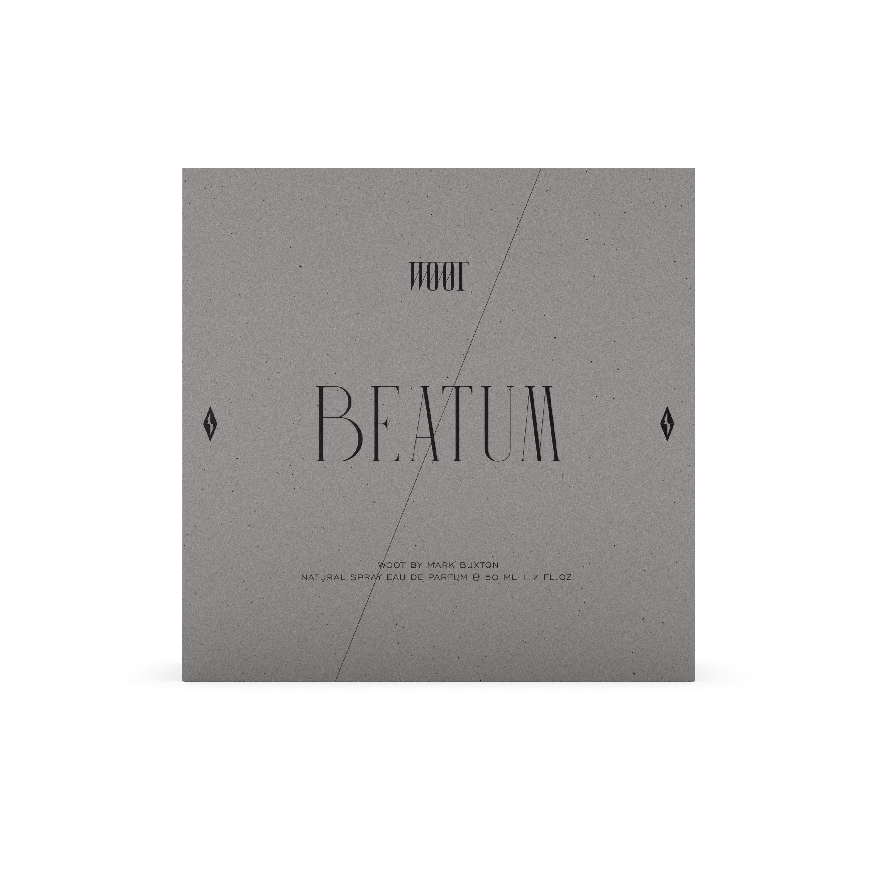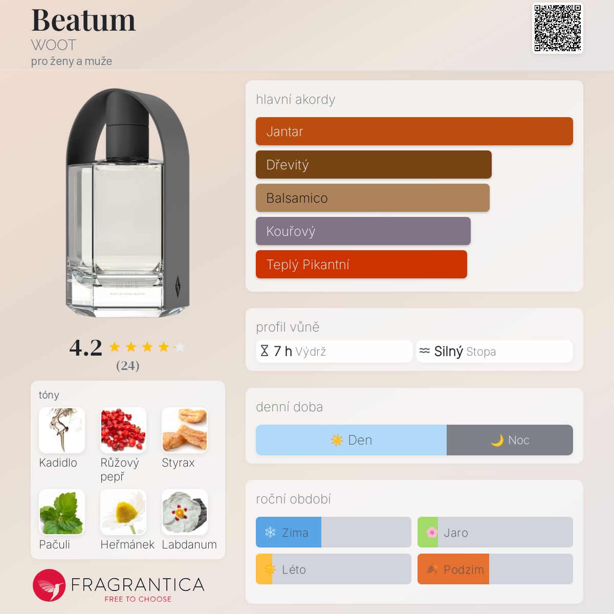 Beatum podle WOOT je Orientální Woody vůně pro ženy a muže. Toto je nová vůně. Beatum byl/a uveden/a v roce 2024. "Nosem" za touto vůní je Mark Buxton. Vrchní tóny jsou Růžový pepř, Heřmánek, Labdanum a Pelargónie; střední tóny jsouKadidlo, Styrax, Elimi a Hřebíček ; základní tóny jsou Pačuli, Santalové dřevo, Cedr, Jantar (ambra), Pižmo, Vanilka a Fazole tonka.