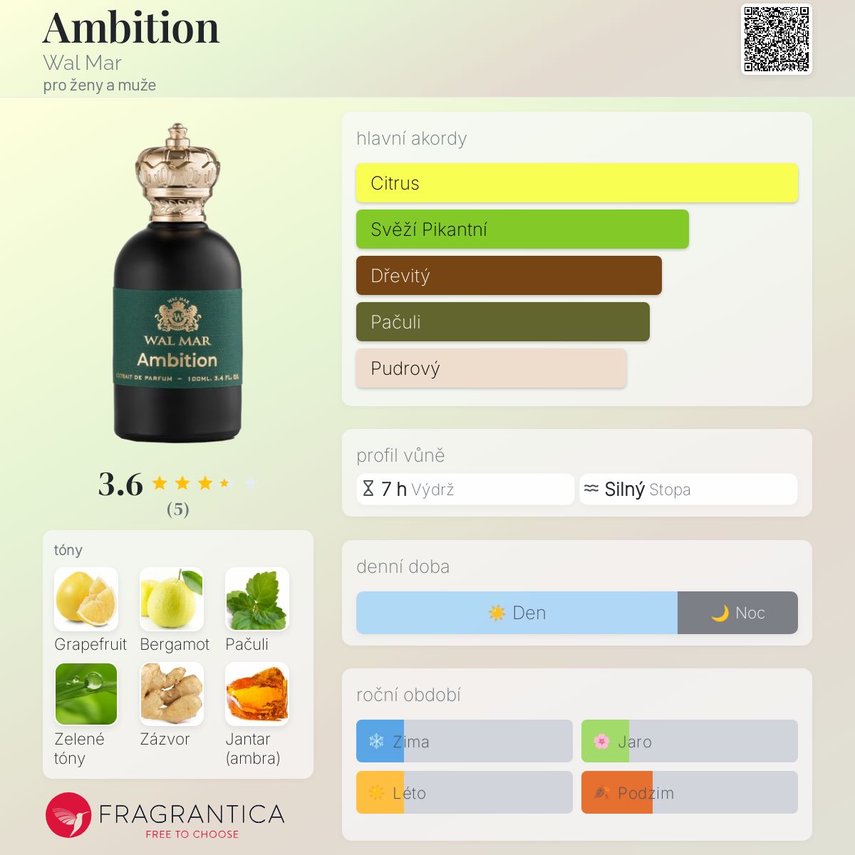 Ambition podle Wal Mar je Woody Floral Musk vůně pro ženy a muže. Toto je nová vůně. Ambition byl/a uveden/a v roce 2024. Vrchní tóny jsou Grapefruit, Bergamot, Jasmín a Magnólie; střední tóny jsouBylinné tóny, Zázvor a Pudrové tóny ; základní tóny jsou Pačuli, Cedr, Jantar (ambra), Pižmo a Kořen kosatce.